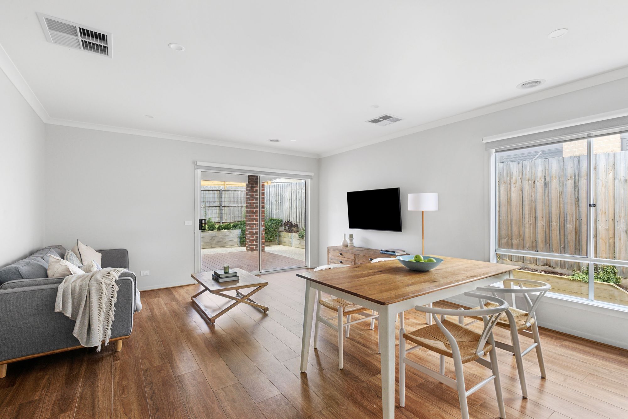 Open Plan Living/Dining: Ample natural light projects into the space from the South and West facing windows and glass sliding doors, each with day and night blinds. Downlights, ducted heating and evaporative cooling.