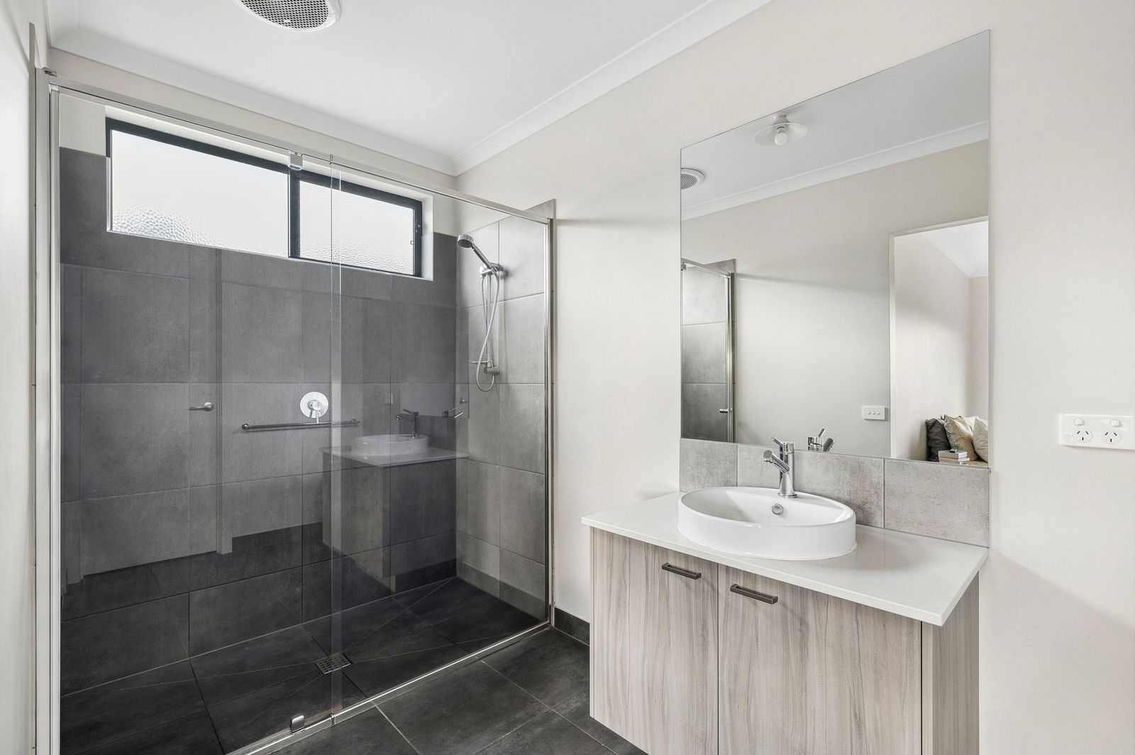 Master Suite: Rear garden views, spacious proportions, open ensuite with single vanity and oversized shower with window and tiled shower base. Large walk-in robe and carpet underfoot.