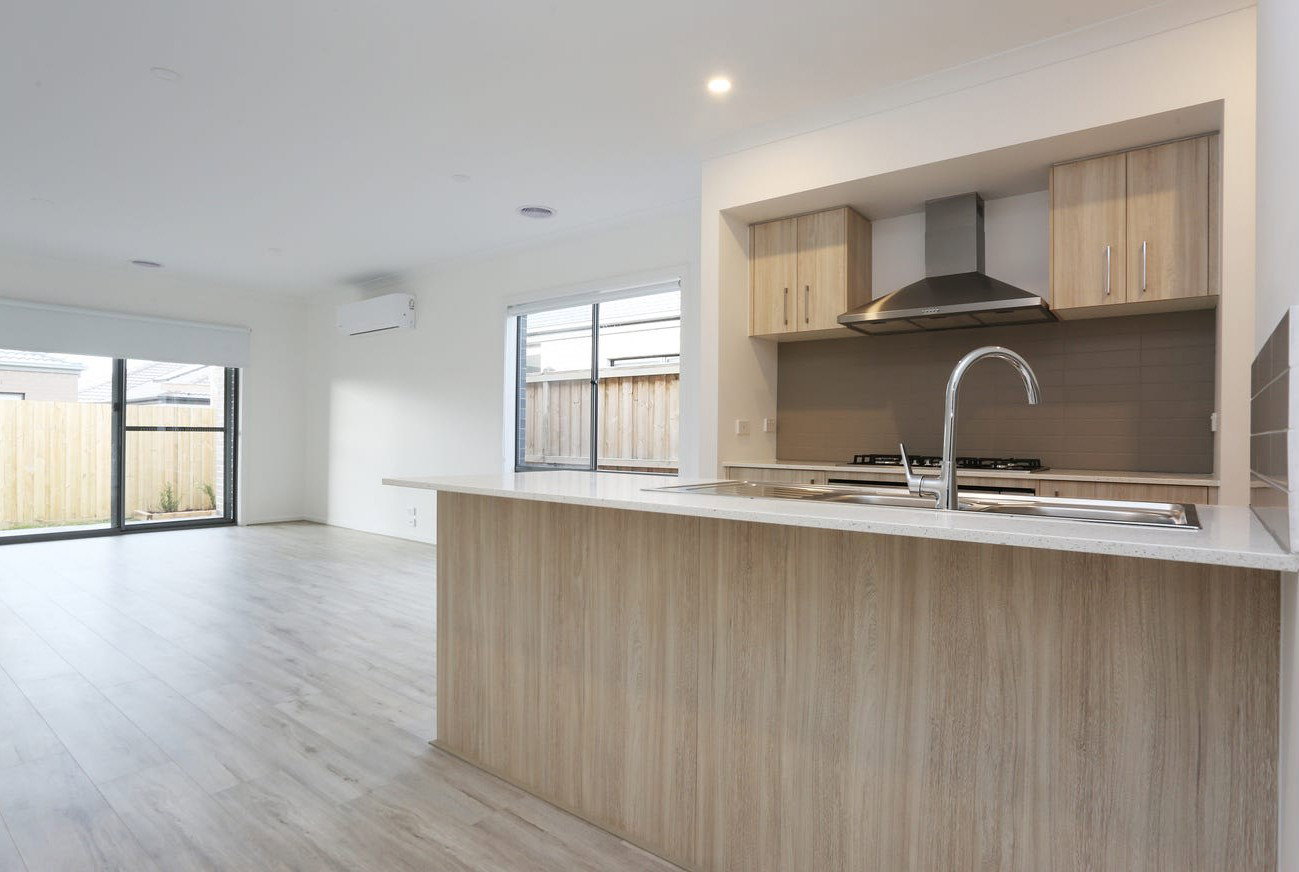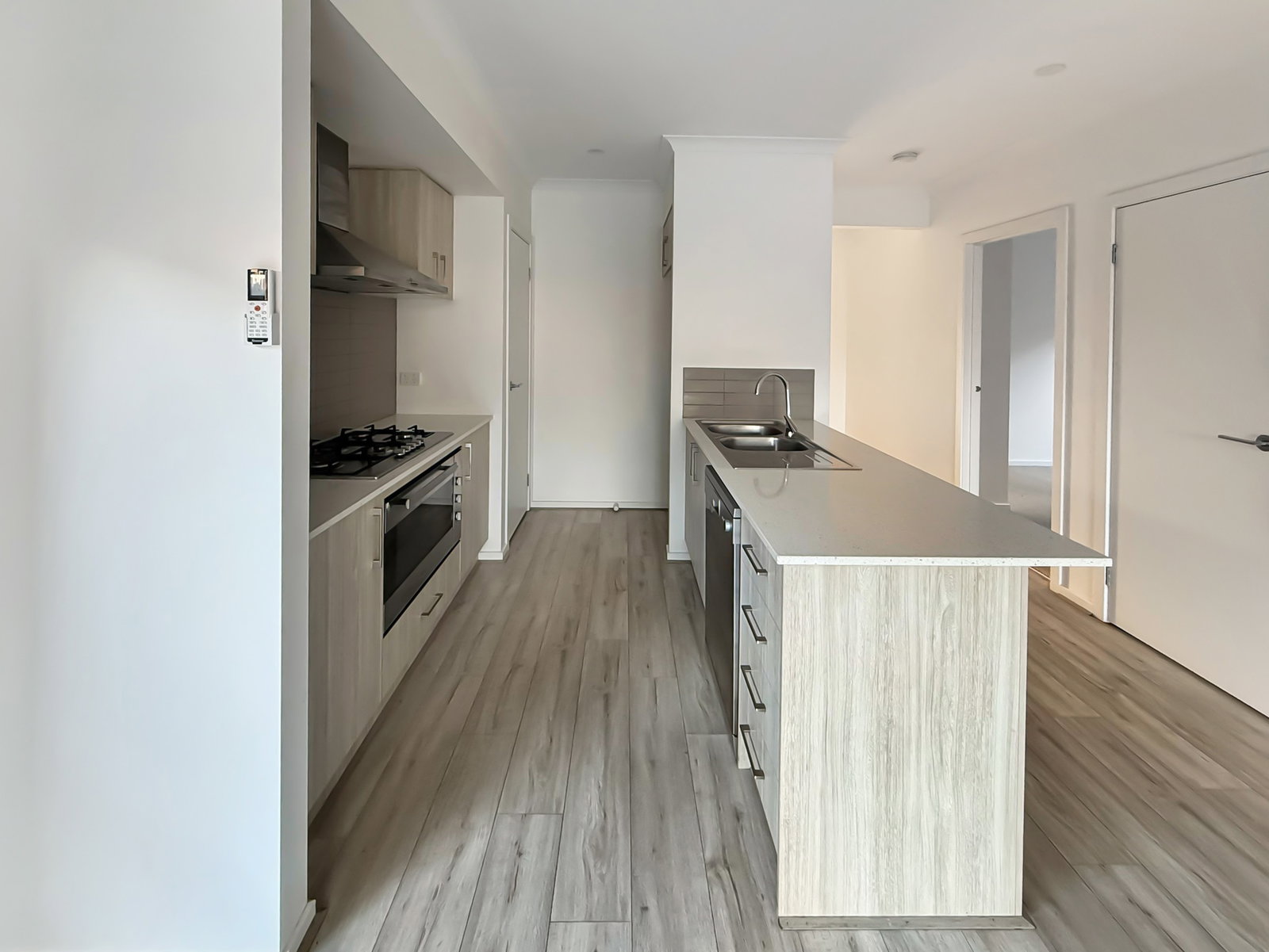 Kitchen: The kitchen is both stylish and highly functional, featuring 20mm stone benchtops to the front and rear benches, high ceilings, and timber-look flooring that flows seamlessly through the space. A 900mm built-in oven and stovetop with rangehood anchors the kitchen, while upgraded cabinetry with overhead storage, downlights, and a dual-basin sink enhance everyday usability. The walk-in pantry provides additional shelving and a dedicated fridge cavity, and year-round comfort is assured with ducted heating and split-system cooling.