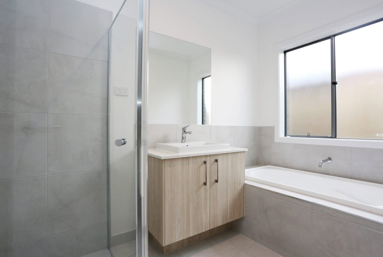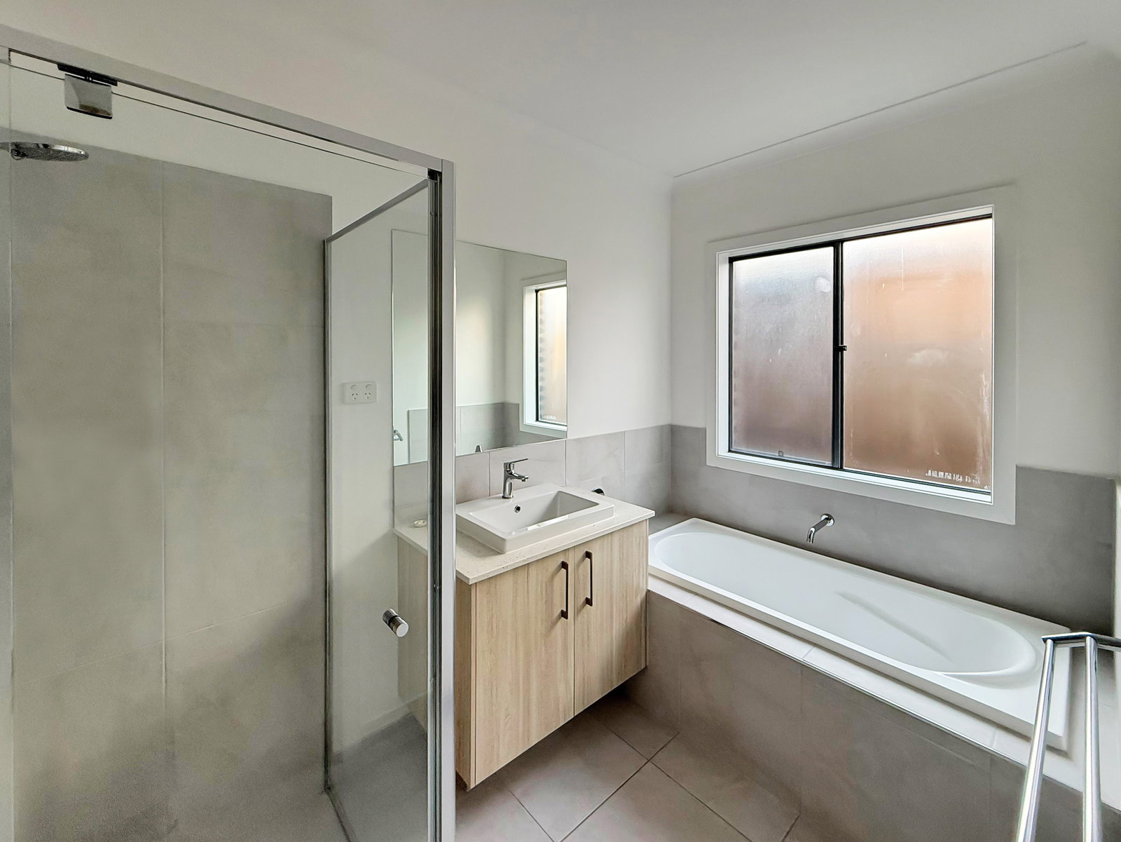 Additional Bathrooms: The central bathroom is finished with a single vanity and basin set on 20mm stone benchtops, complemented by cabinetry and a mirrored splashback. A raised bath, separate shower, and wide frosted window enhance both practicality and natural light, while a separate toilet adds convenience for family living.