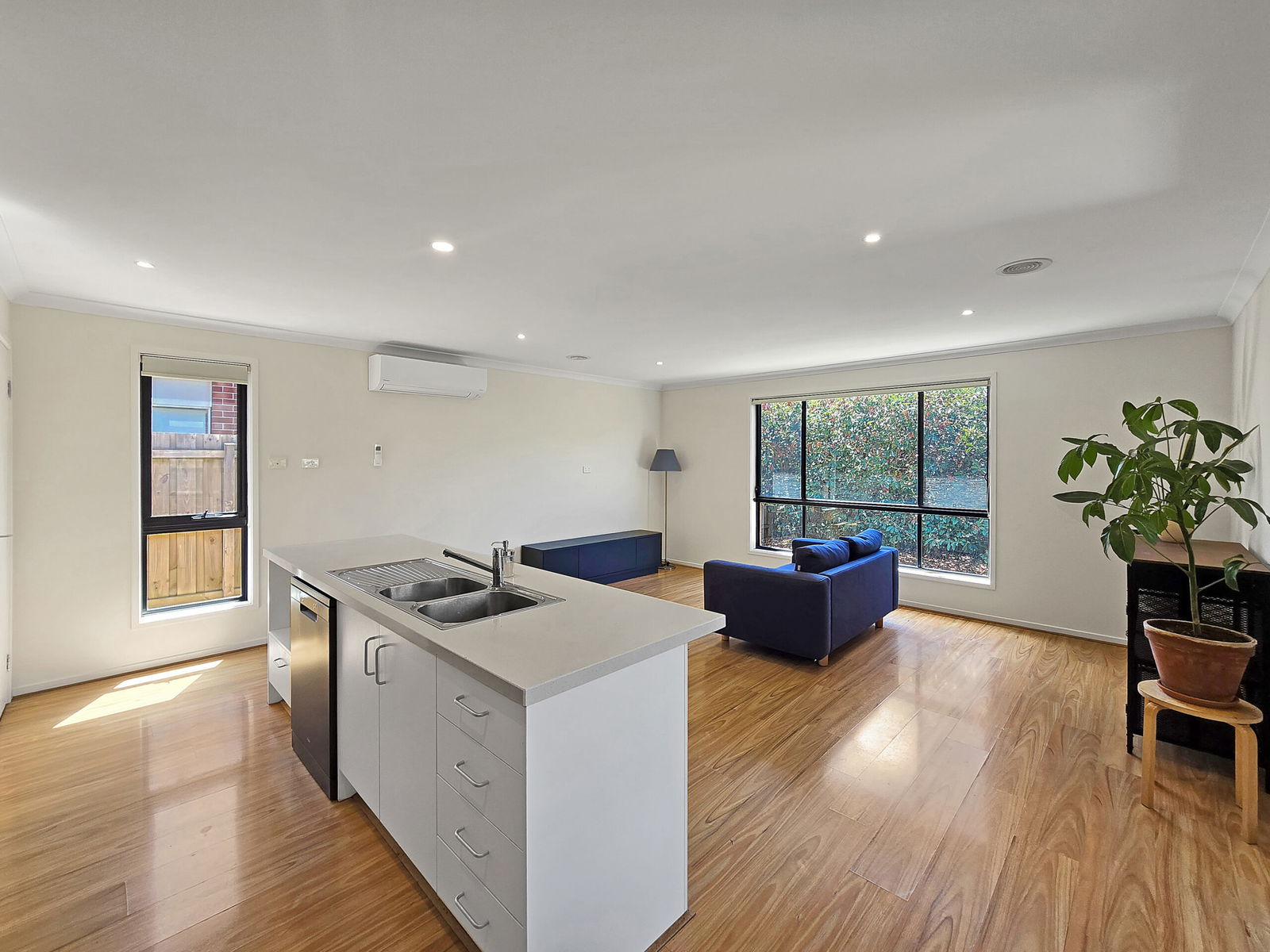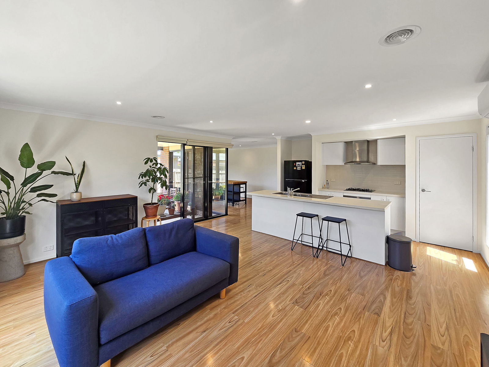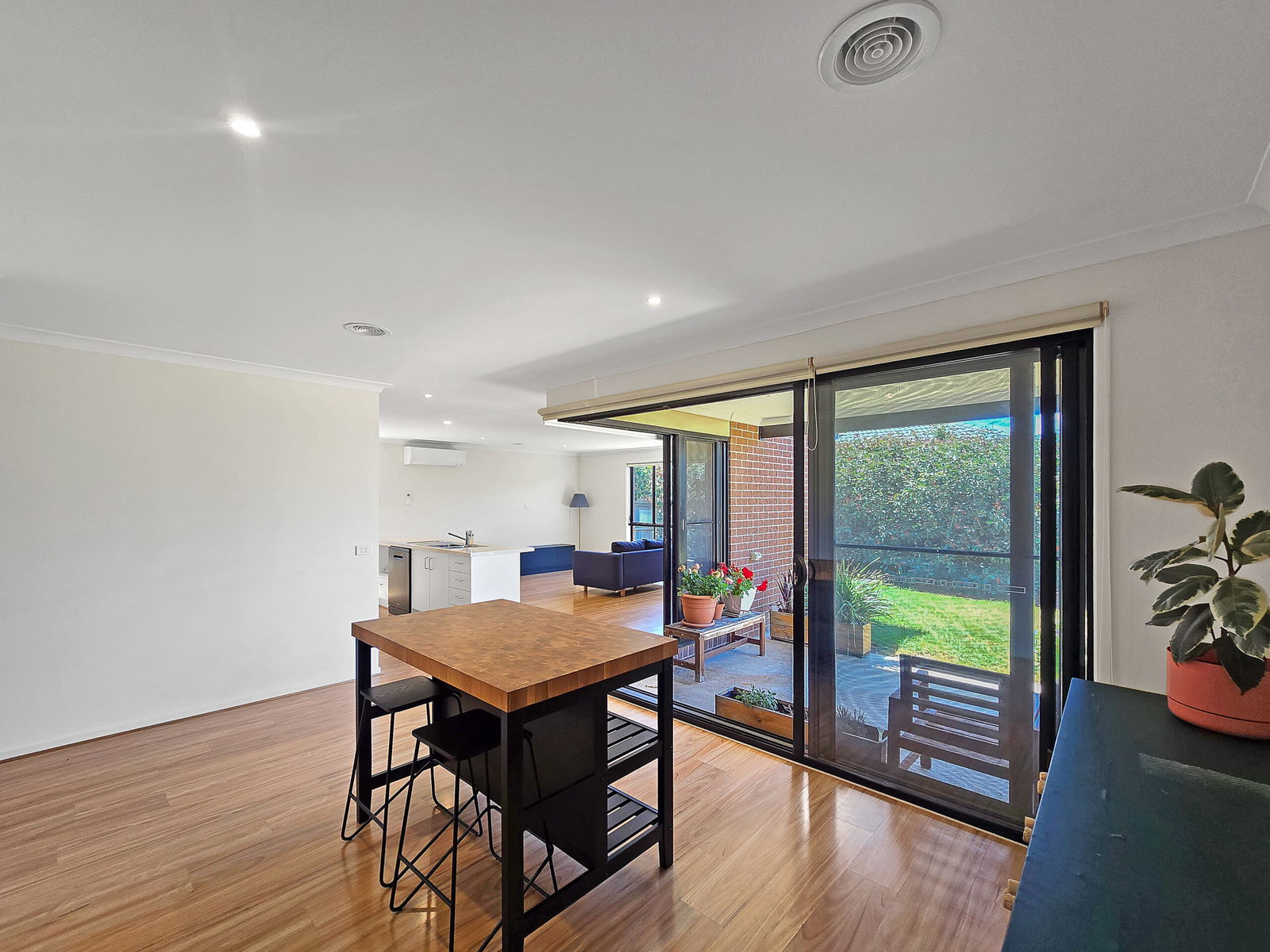Living/Dining: Open living/dining plan with ample natural light, large glass & flywire sliding stacker doors from living and dining area to outdoor undercover alfresco, roller blinds, split-system air conditioning, ducted heating, downlights & timber laminate flooring.