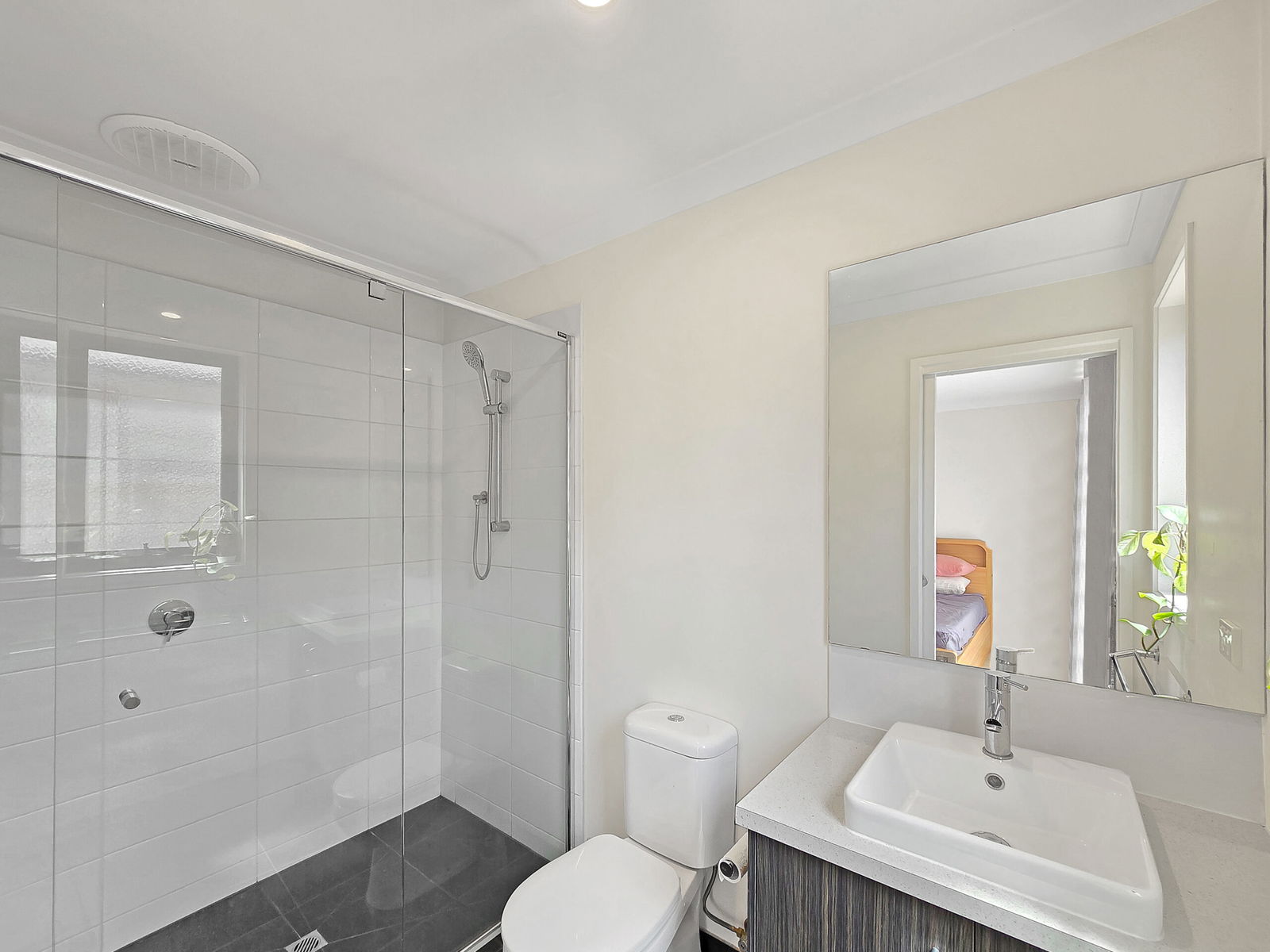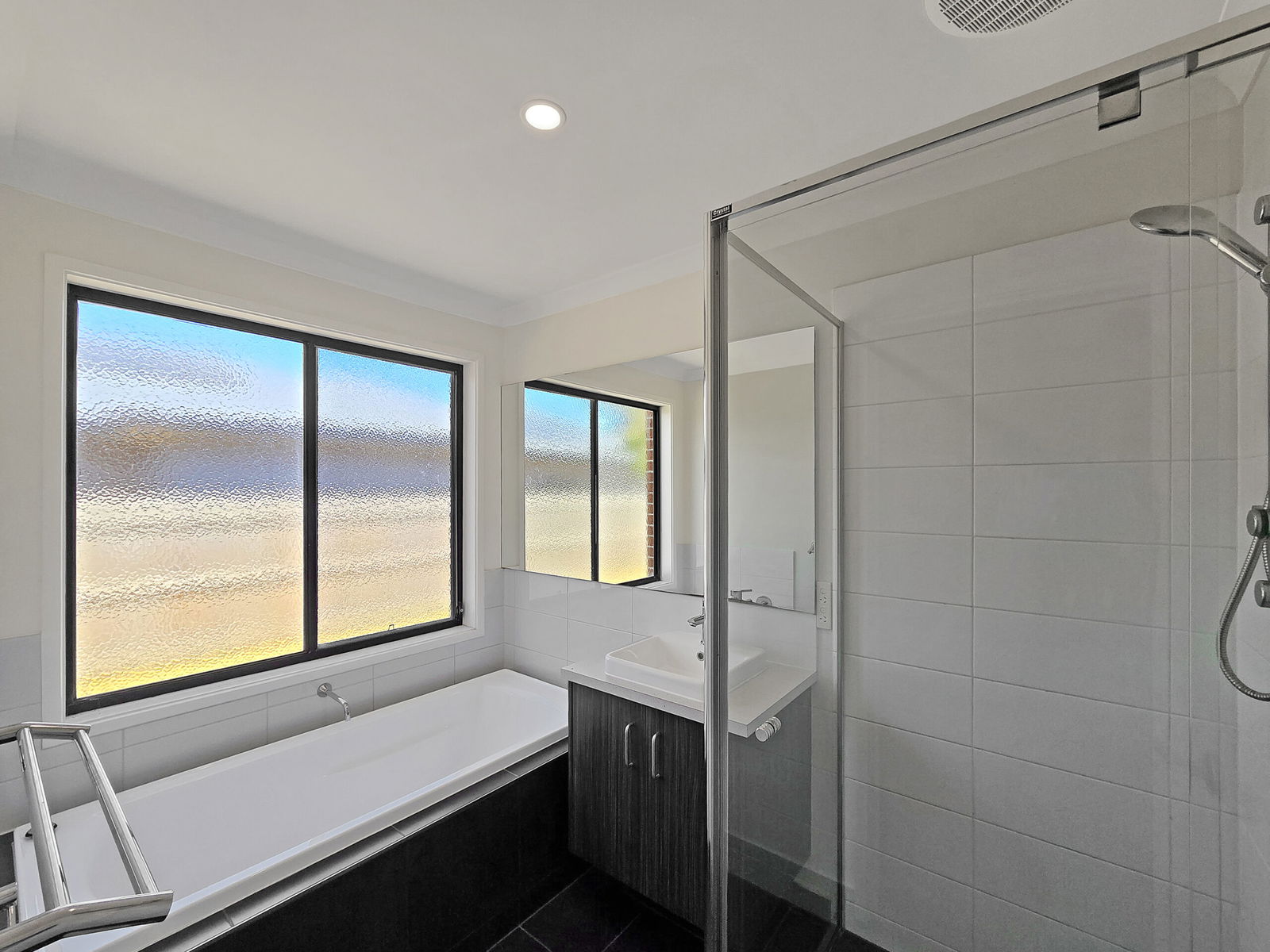 Main bathroom: Bath, semi frameless shower, basin and vanity with large mirror splashback, chrome fittings, frosted window & separate toilet.