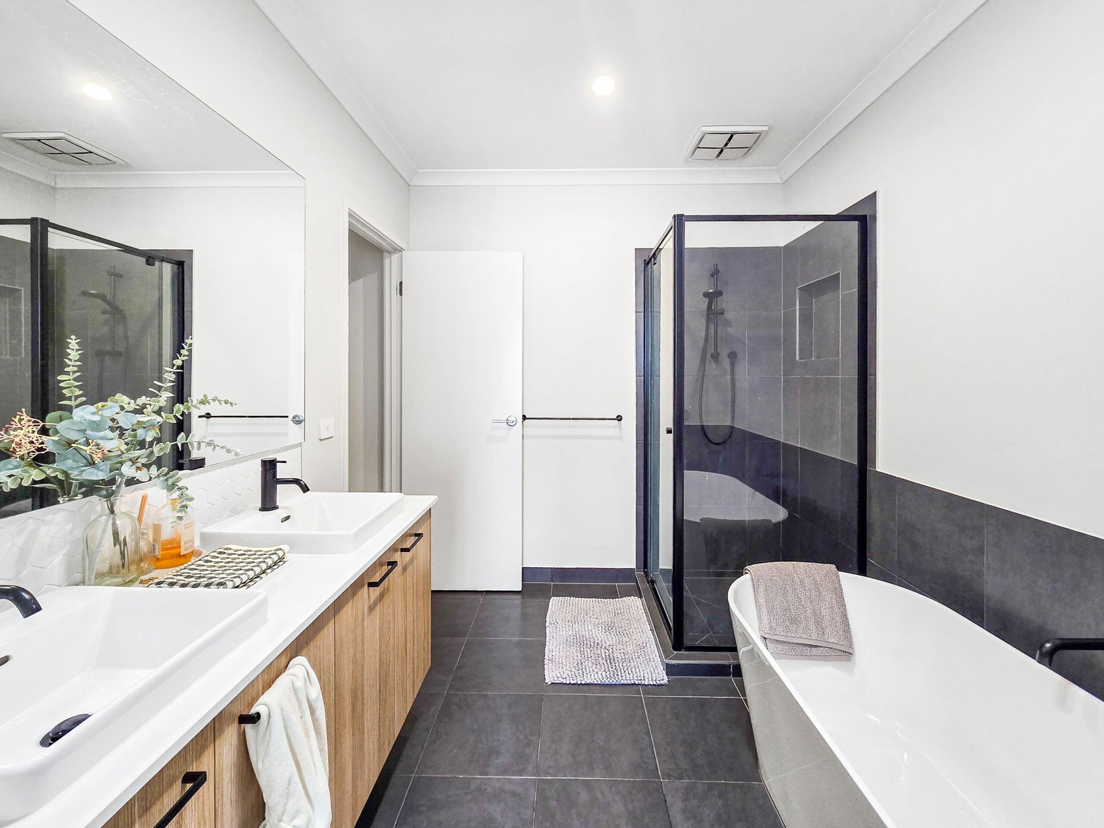 – Main bathroom with bathtub, double vanity, shower and a separate toilet