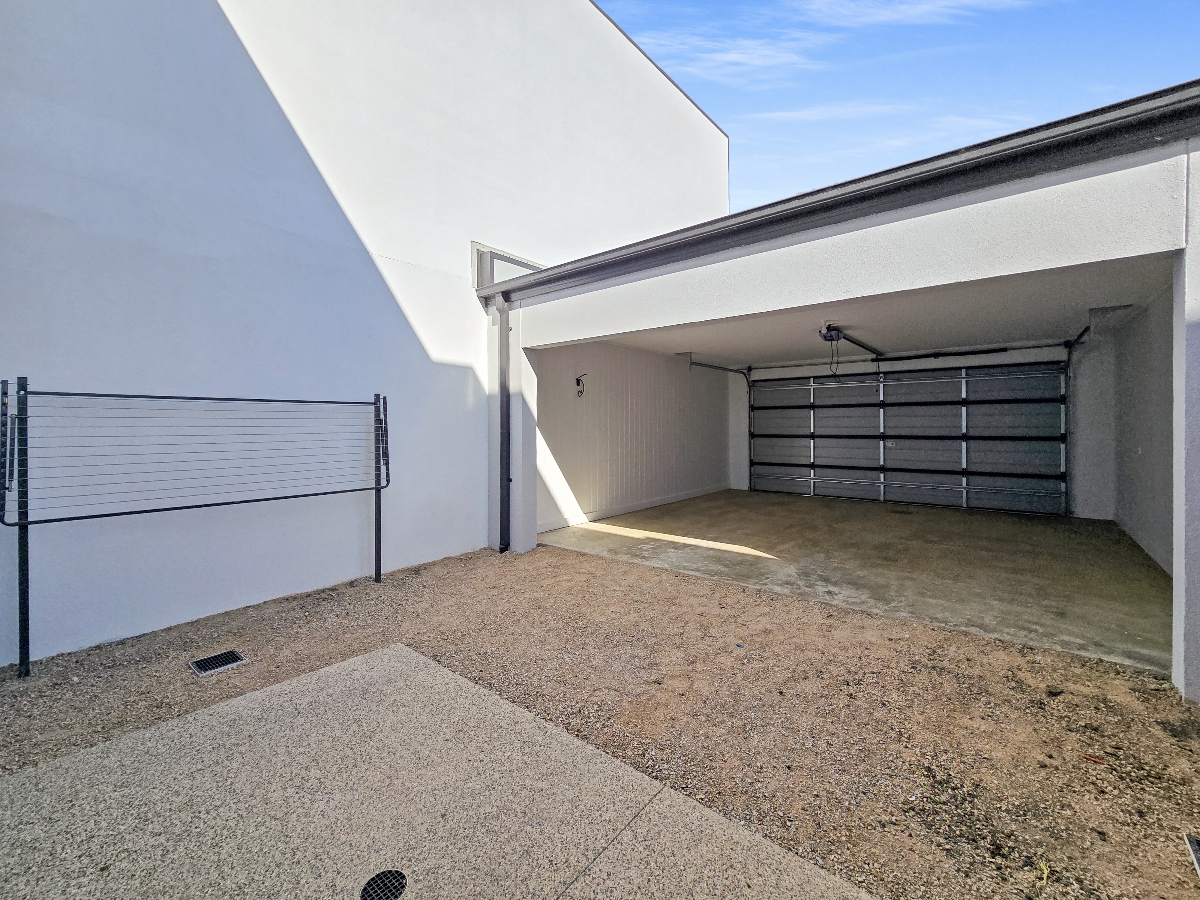 – Low-maintenance backyard with exposed aggregate concrete space, grass and clothesline installed