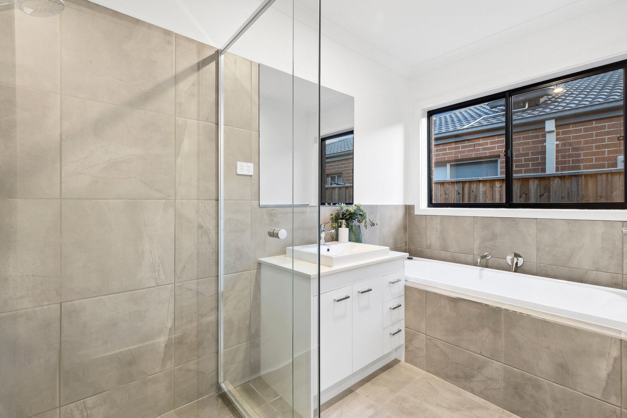 – Main Bathroom with 20mm stone benchtop, single vanity with ample storage, and bath.
