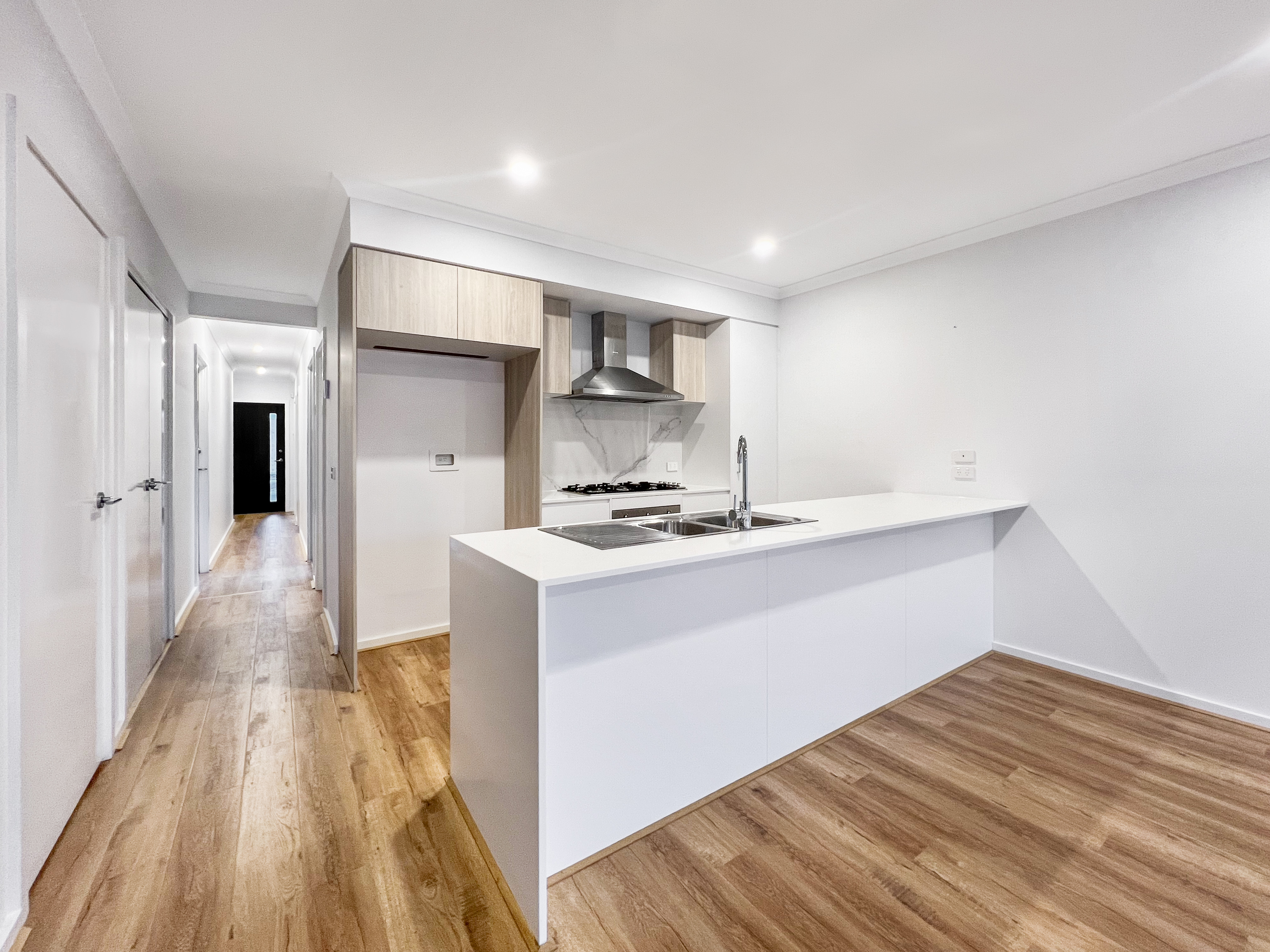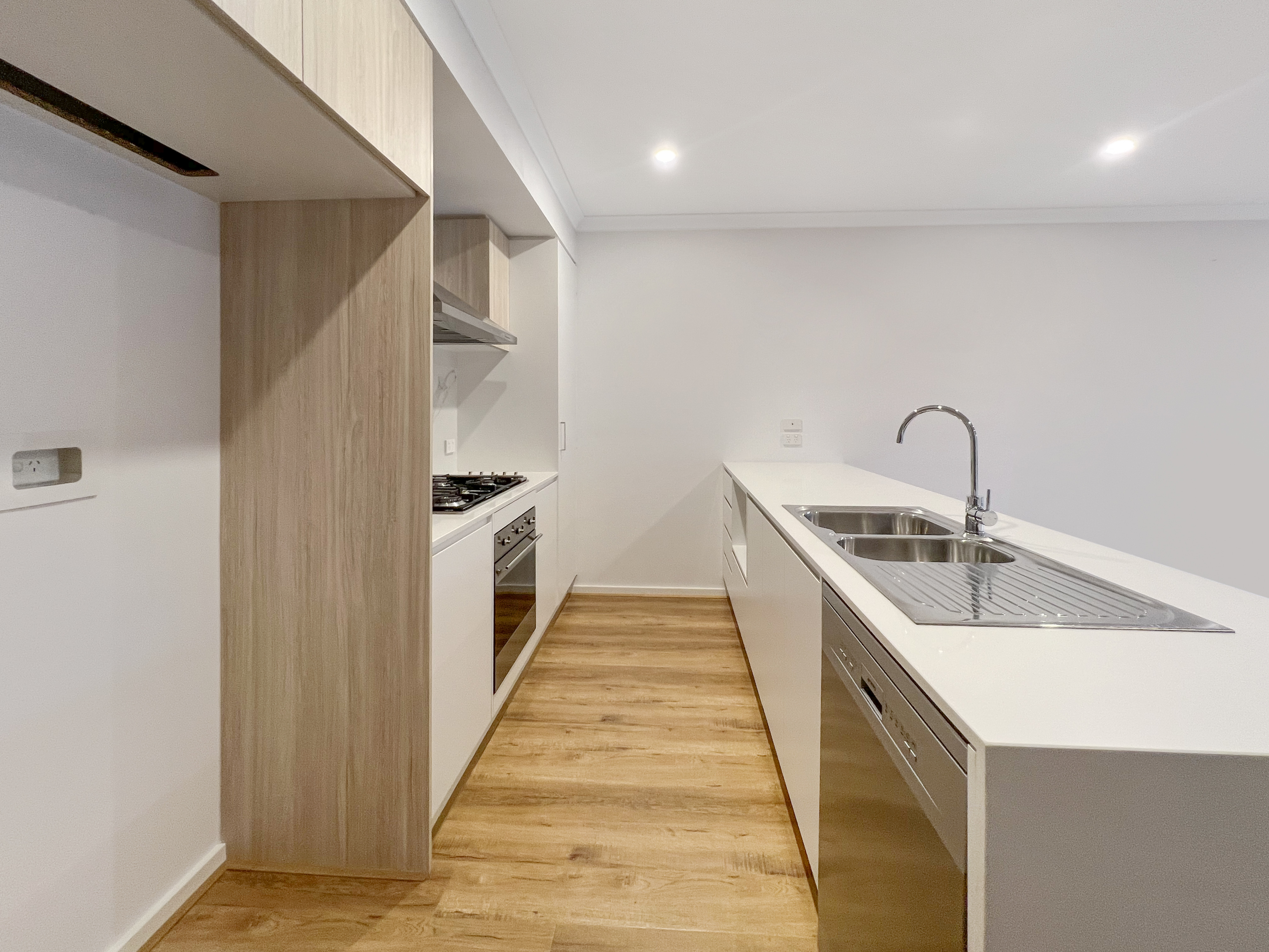 – The kitchen has a 5 burner gas cooktop, 600mm oven, microwave cavity, dishwasher, plenty of cupboards and a built-in pantry for storage