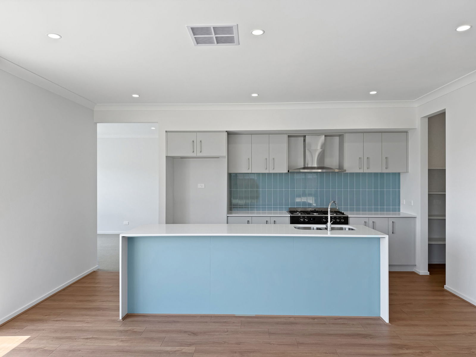 * Kitchen with 5 burner gas cook-top, 900mm oven, dishwasher, stone bench tops, and large walk in pantry