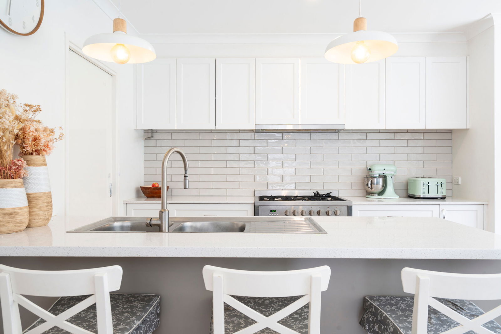 – Kitchen with stainless steel appliances (freestanding 5 burner cooktop & 900mm oven), dishwasher and spacious walk-in pantry. Also has plenty of bench and cupboard space including handy pot drawers with beautifully finished profiling