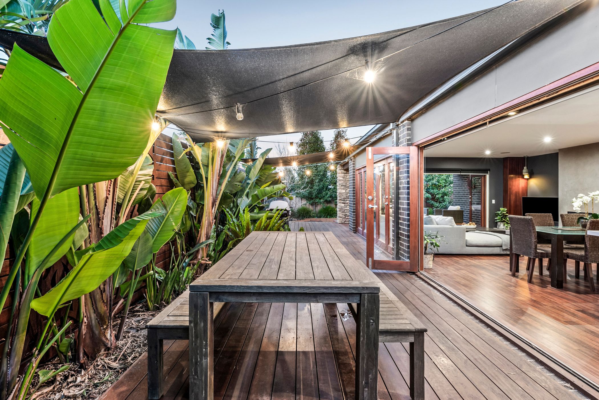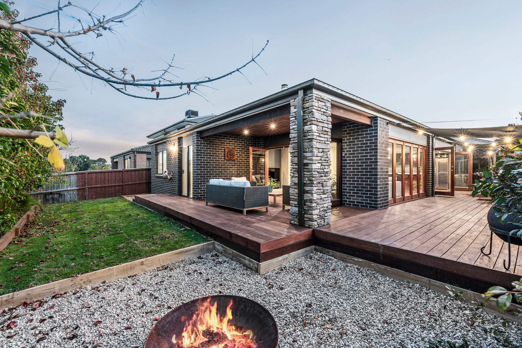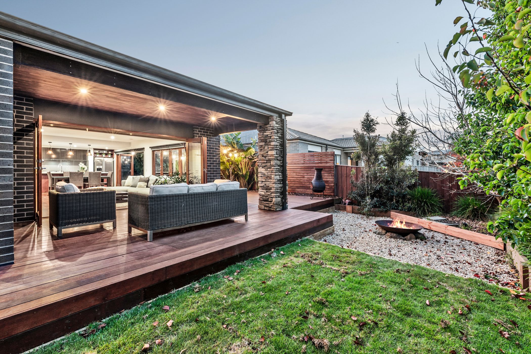 Outside: Sensational deck alfresco with shade sails, lush resort-style gardens, fire pit area, rear covered deck alfresco with timber-lined ceiling and downlights, and secure play space for kids.