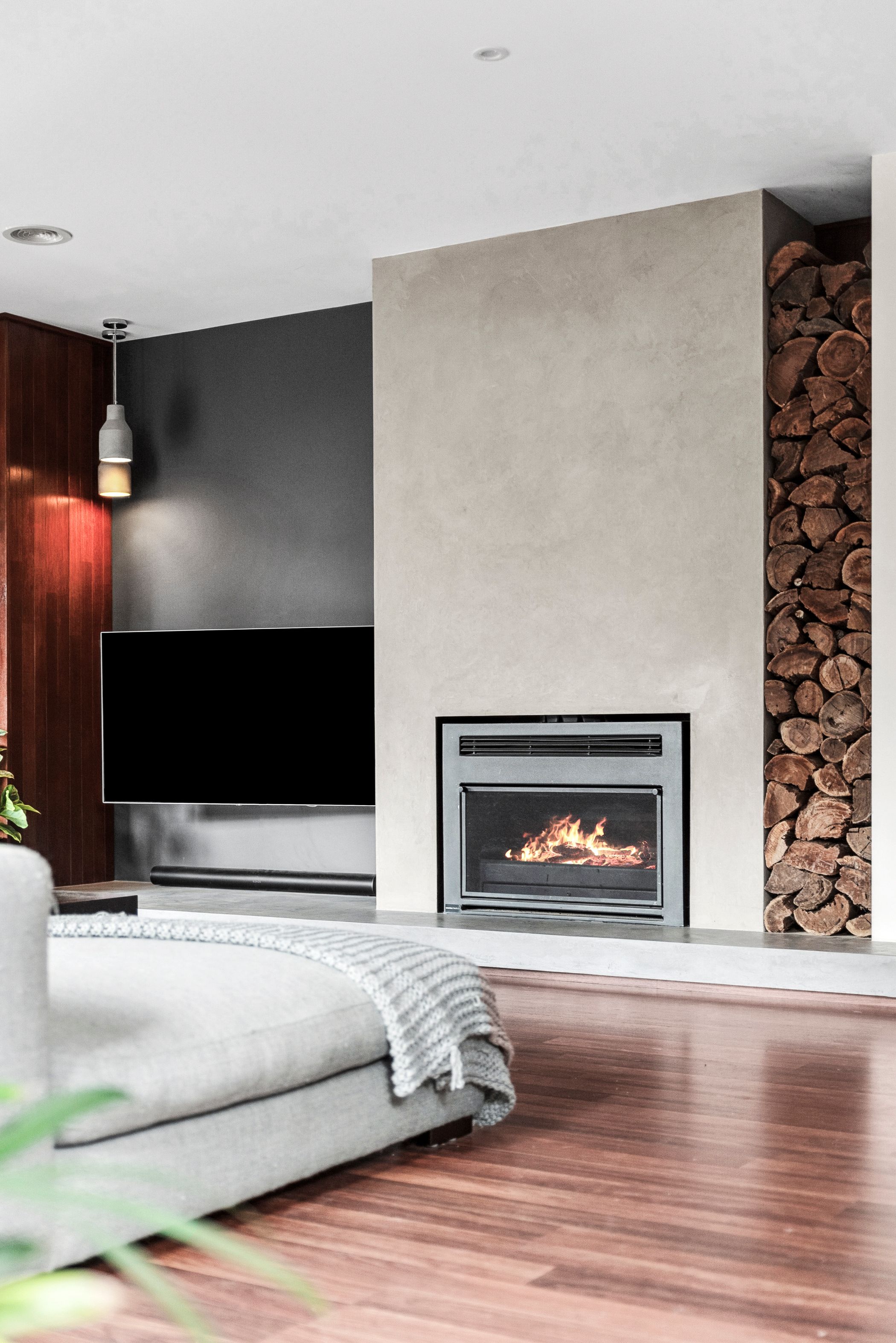 Open Plan Living/Dining: Feature concrete hearth with vertical wood storage and floating step, solid wood heater, walls of windows with glass bi-folds to alfresco, roller blinds.