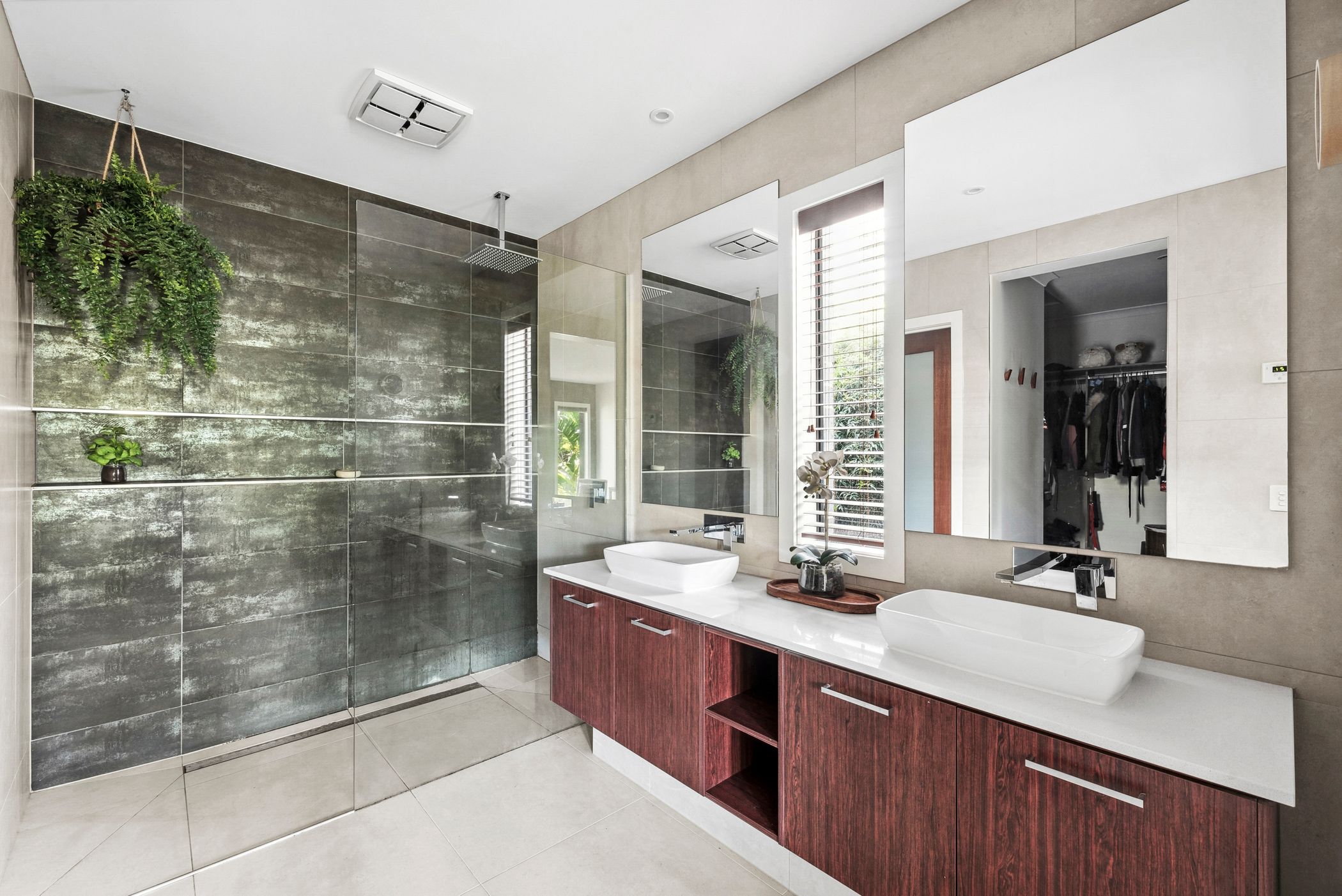 Master Suite: Double door entry, large proportions with views to the front, and open ensuite with double vanity with underbench storage, Eternity Plus (water) temperature regulator, walk-in shower with ceiling shower head and niche. Large walk-in robe, roller blinds and downlights.