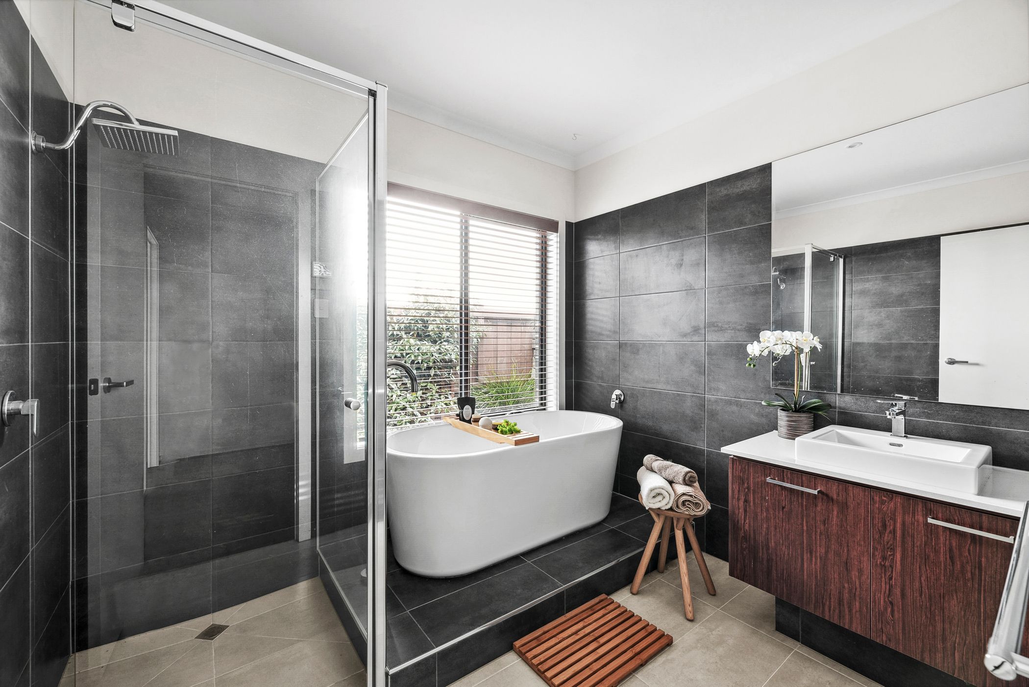 Main Bathroom: Elevated feature bath with freestanding tap, shower with large shower head, single vanity and garden outlooks.