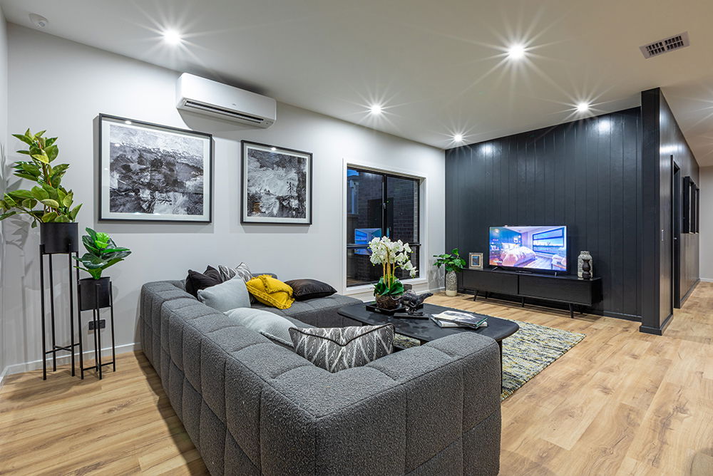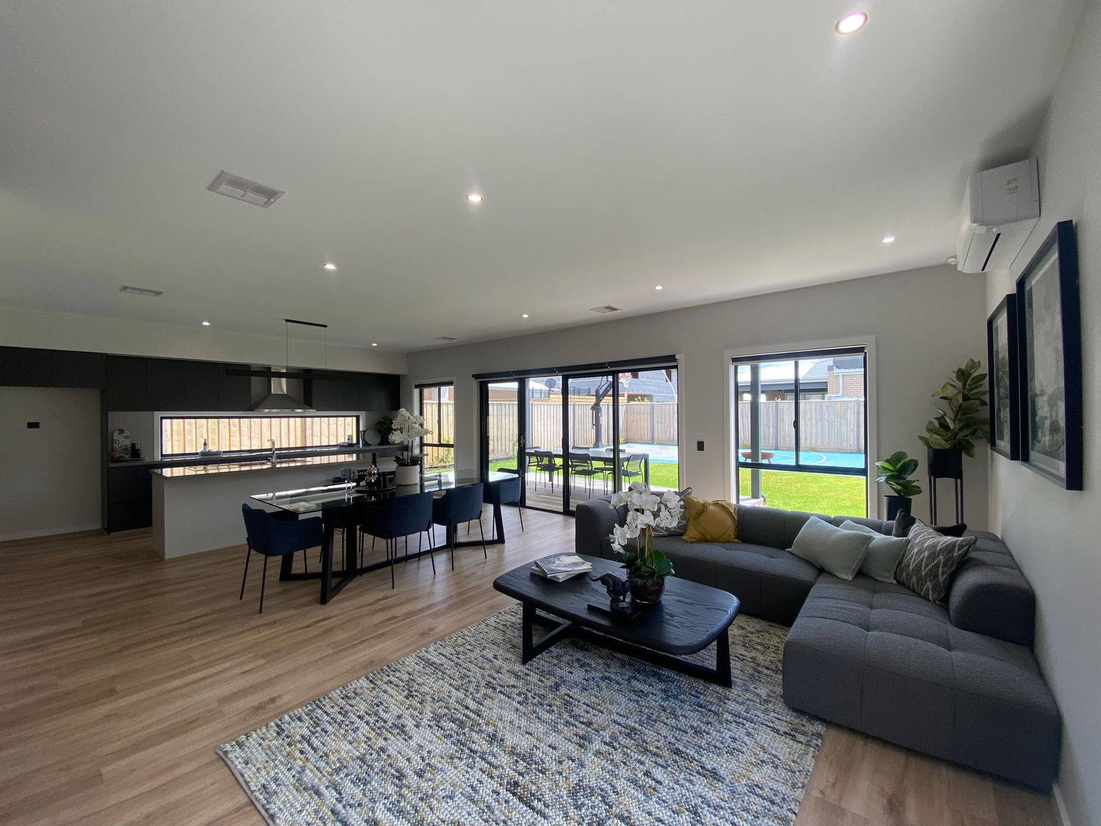 Open plan kitchen/ living/ dining, timber laminate flooring, axon cladding feature wall, down lights, ducted heating, stacker doors open to outdoor undercover alfresco