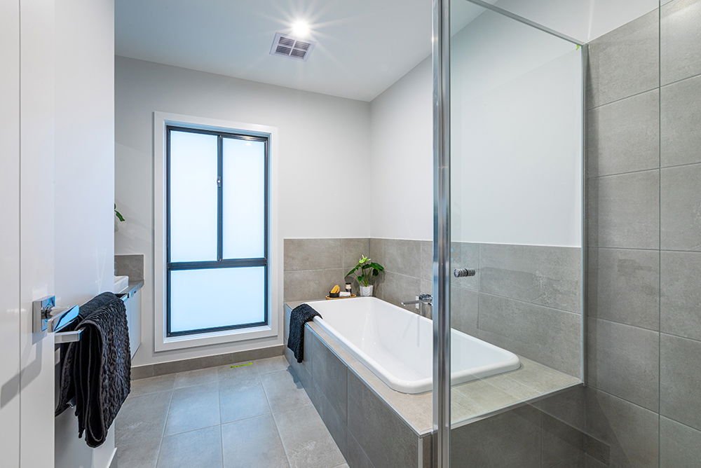 Main bathroom with a bath, 900×900 shower, vanity with feature basin, down lights and separate toilet