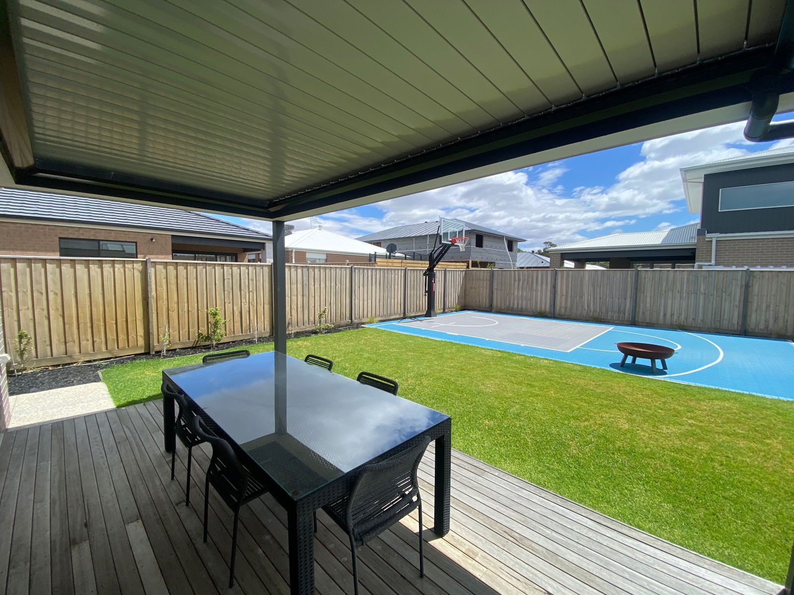 Outdoor area with exposed aggregate concrete, outdoor undercover grand alfresco with a deck. 1/2 Basketball court included.