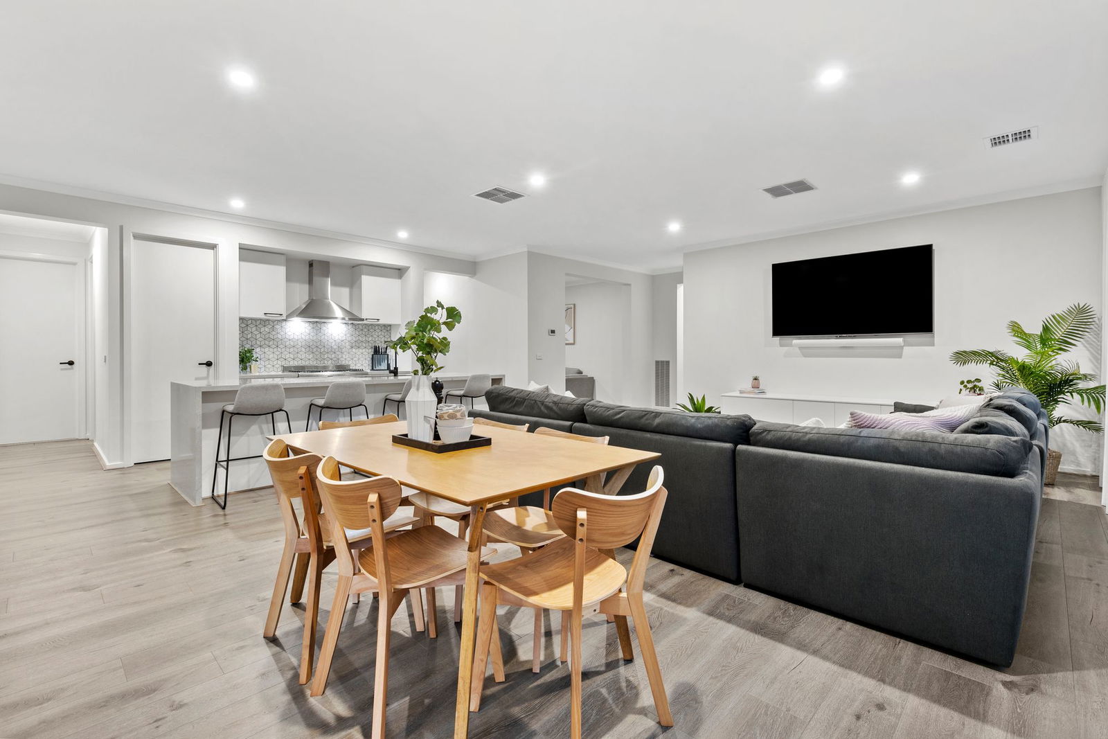 Dining – Large open plan kitchen/dining area with wide windows and glass sliding doors through to the outdoor living space, downlights, ducted heating and evaporative air-conditioning, timber laminate flooring.
