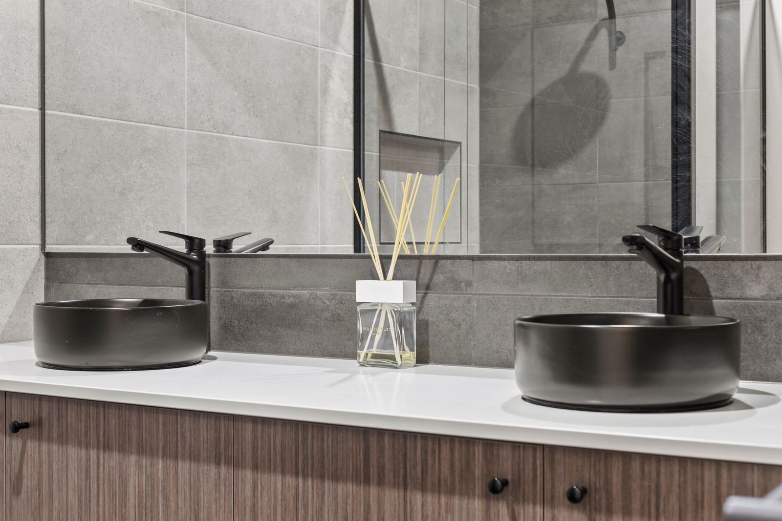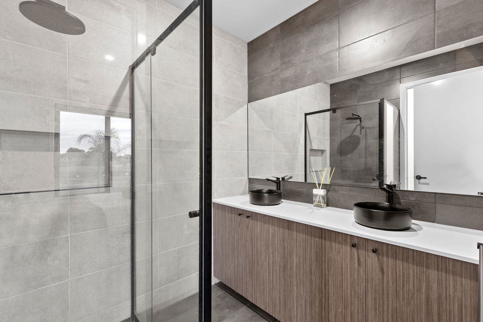 Ensuite – Large shower with rainfall showerhead & wide shower niche, dual single sink and large 20mm stone benchtop vanity with ample storage, toilet, large mirror splashback and matte black fittings.