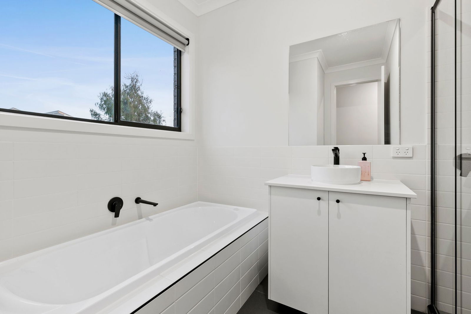 Main Bathroom – Shower with niche, raised bath, single sink and 20mm stone benchtop vanity with ample storage and matte black fittings, window with roller blinds.