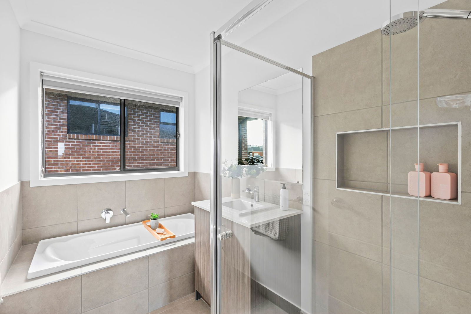 Main Bathroom: Cool coastal tones, built-in tub, single vanity with underbench storage, and shower with wall niche. Separate toilet.