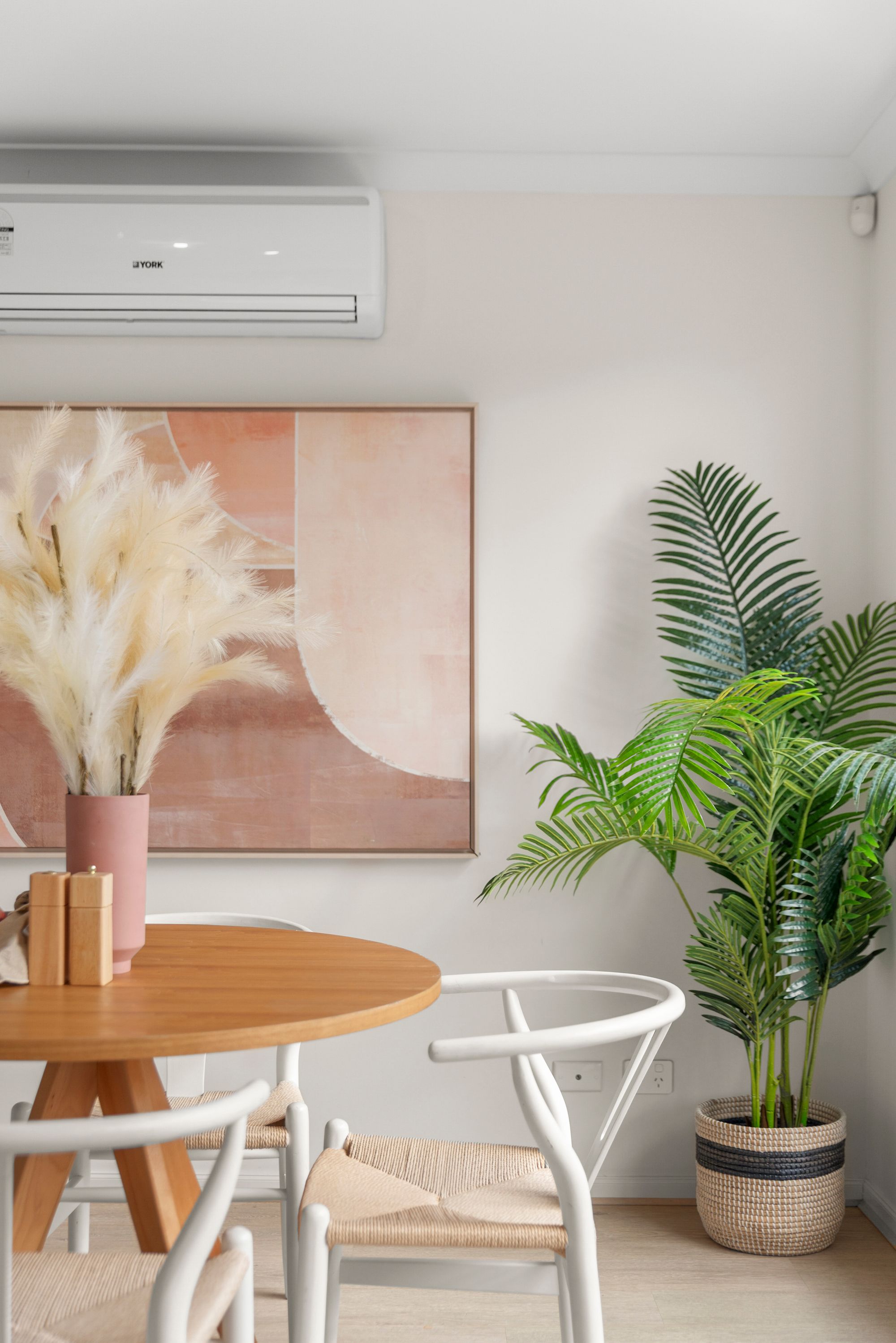 Living – open plan adjoining living, dining & kitchen, timber laminate floorboards, gas ducted heating and split system air cooling, abundant natural light, roller blinds, main living opens through glass sliding doors to rear backyard