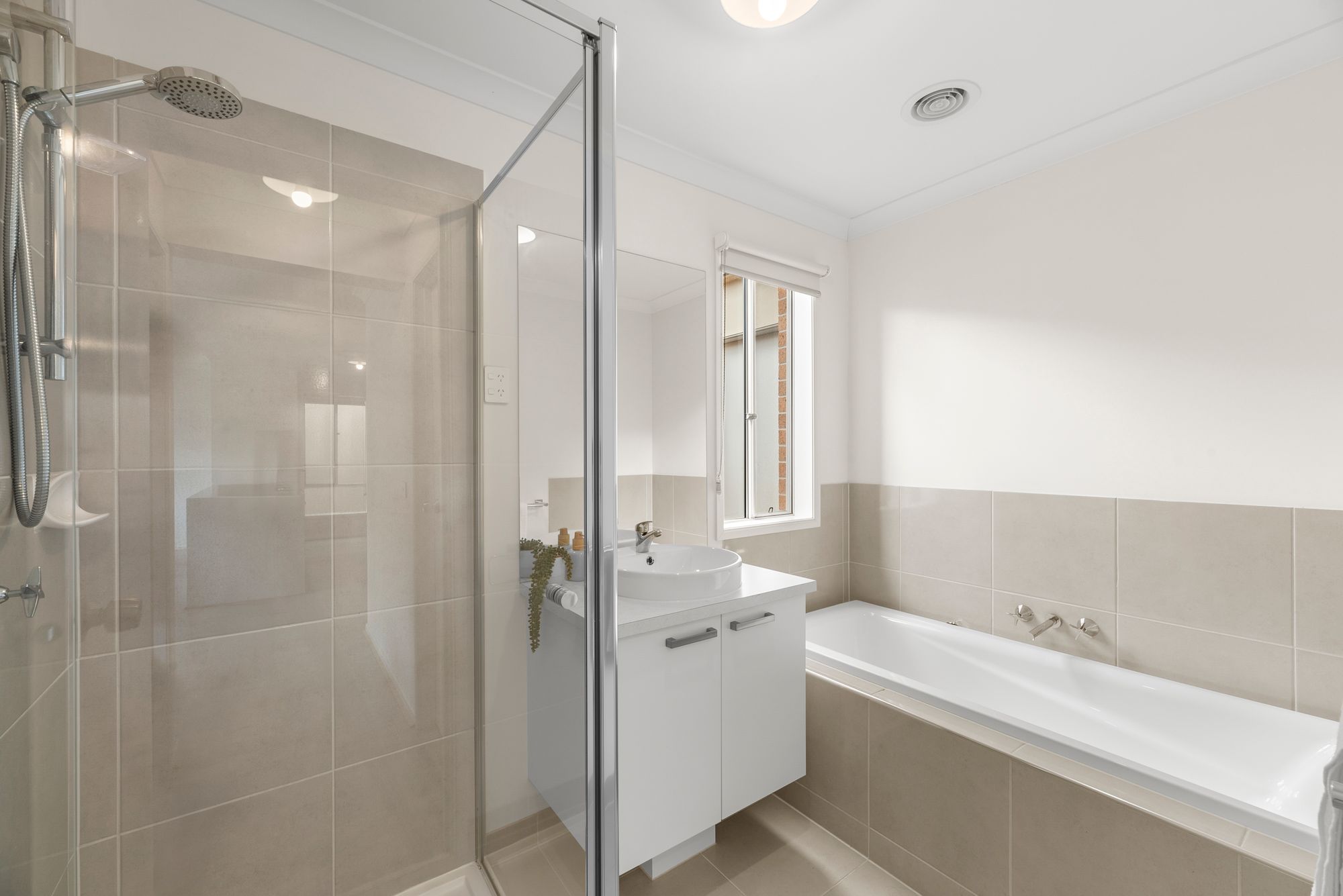 Main bathroom – vanity, tiled single shower with chrome fittings, bath & separate toilet