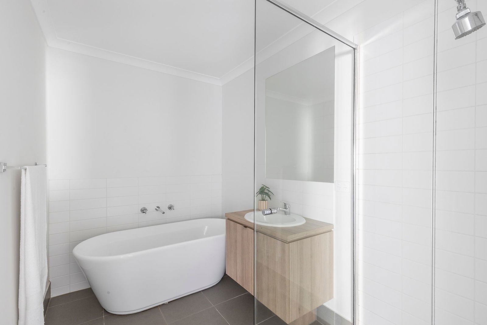 Additional Bathroom: A stylish main bathroom services the home, boasting a freestanding bath, single vanity with cabinetry, and a separate shower.