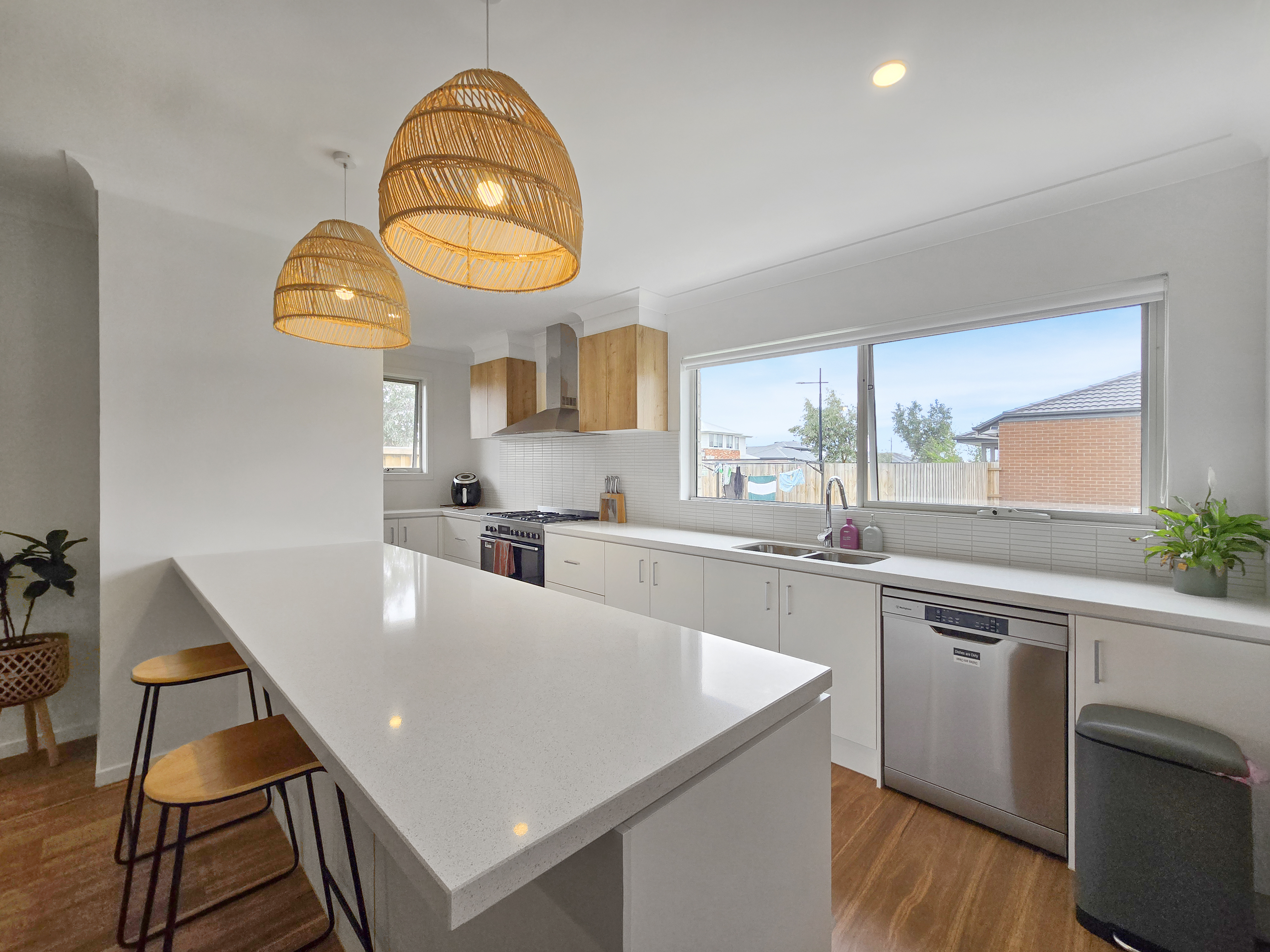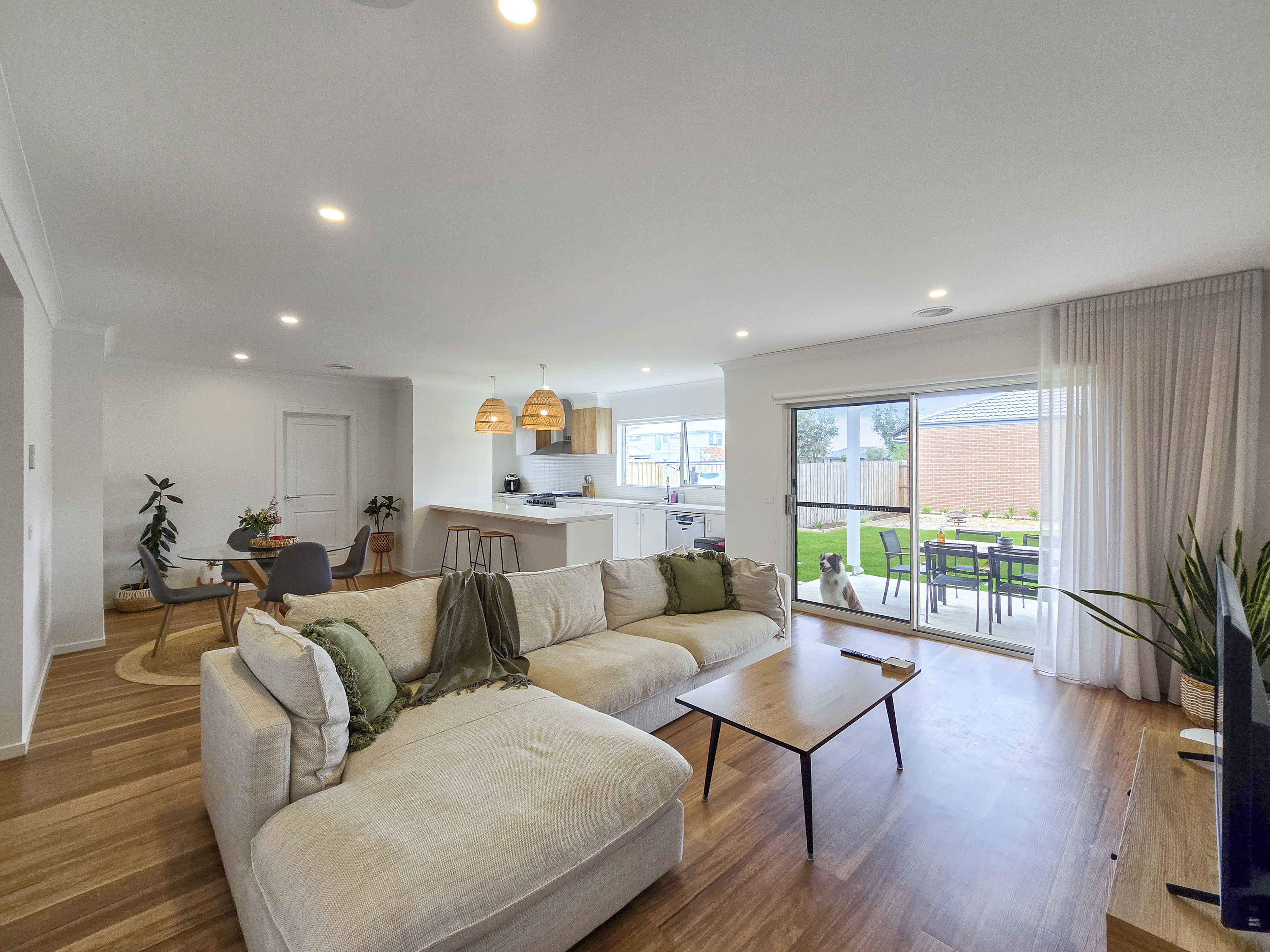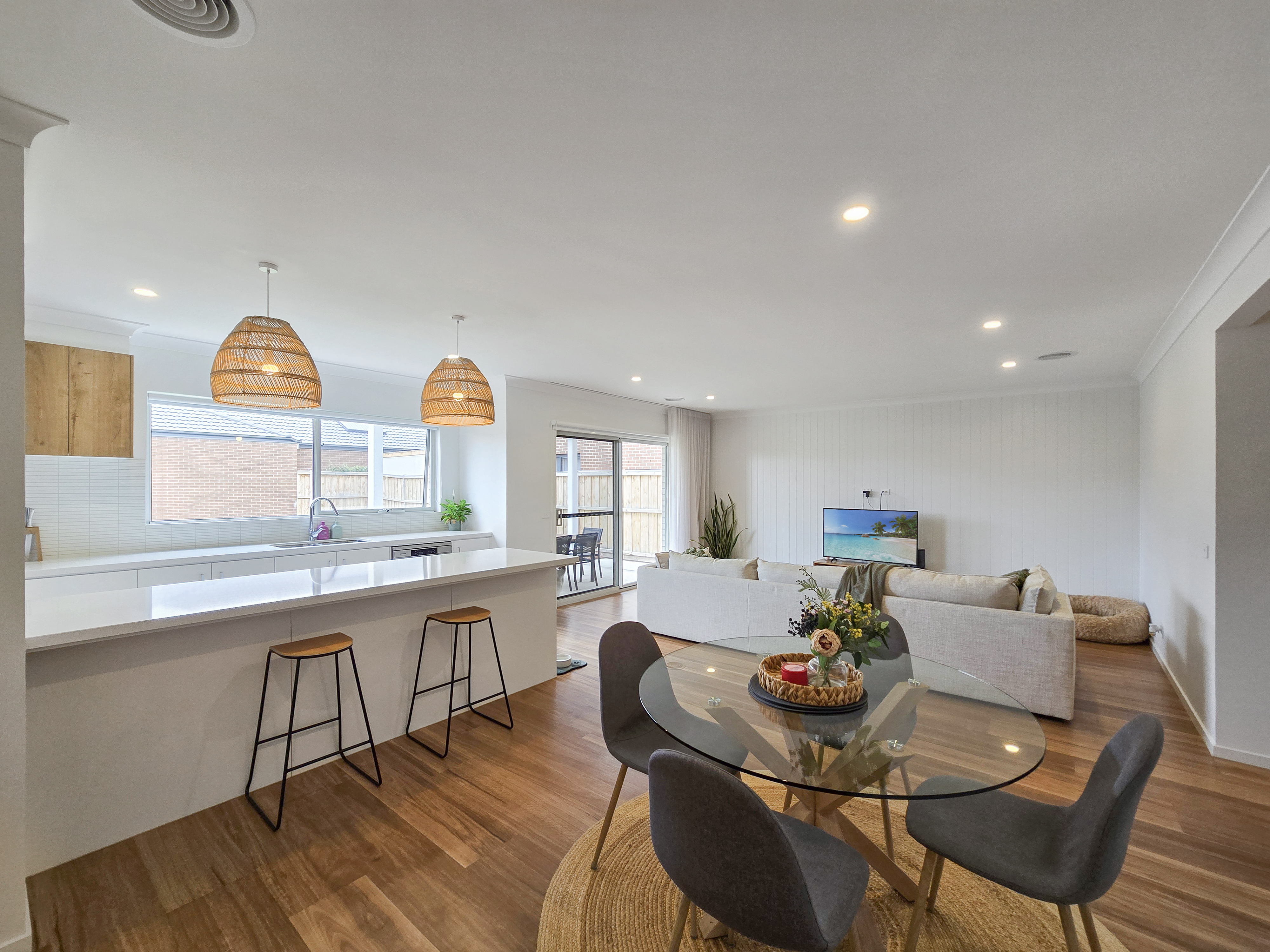 – Light filled open plan kitchen, living and dining area, with sliding doors with flyscreens installed, leading seamlessly out to the incredible alfresco area
