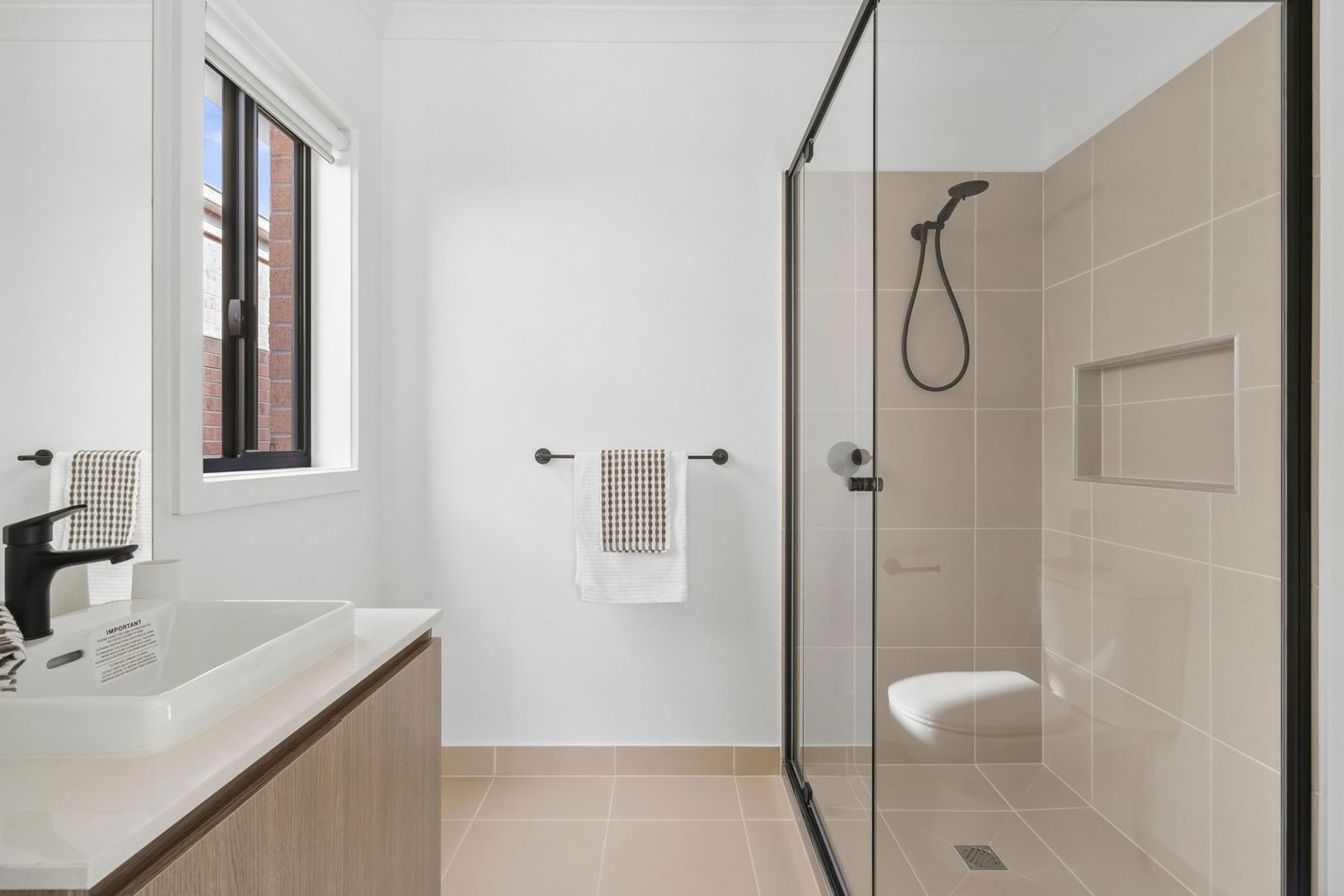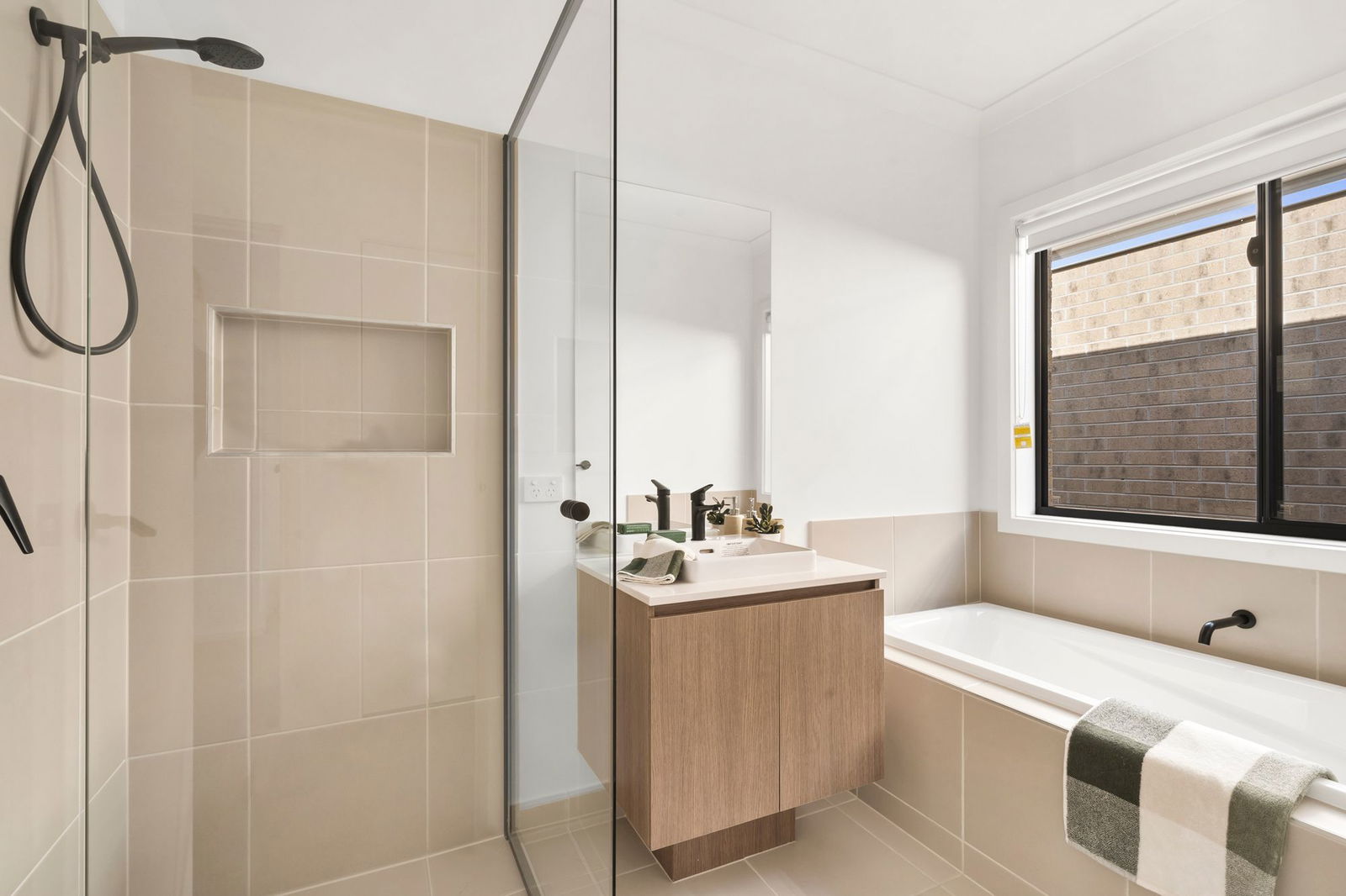 Main Bathroom: Centrally located to service the additional bedrooms and guests, the main bathroom includes a raised bathtub, shower, and a single vanity with 20mm stone benchtops and cabinetry. A separate toilet enhances the practicality of the floorplan.