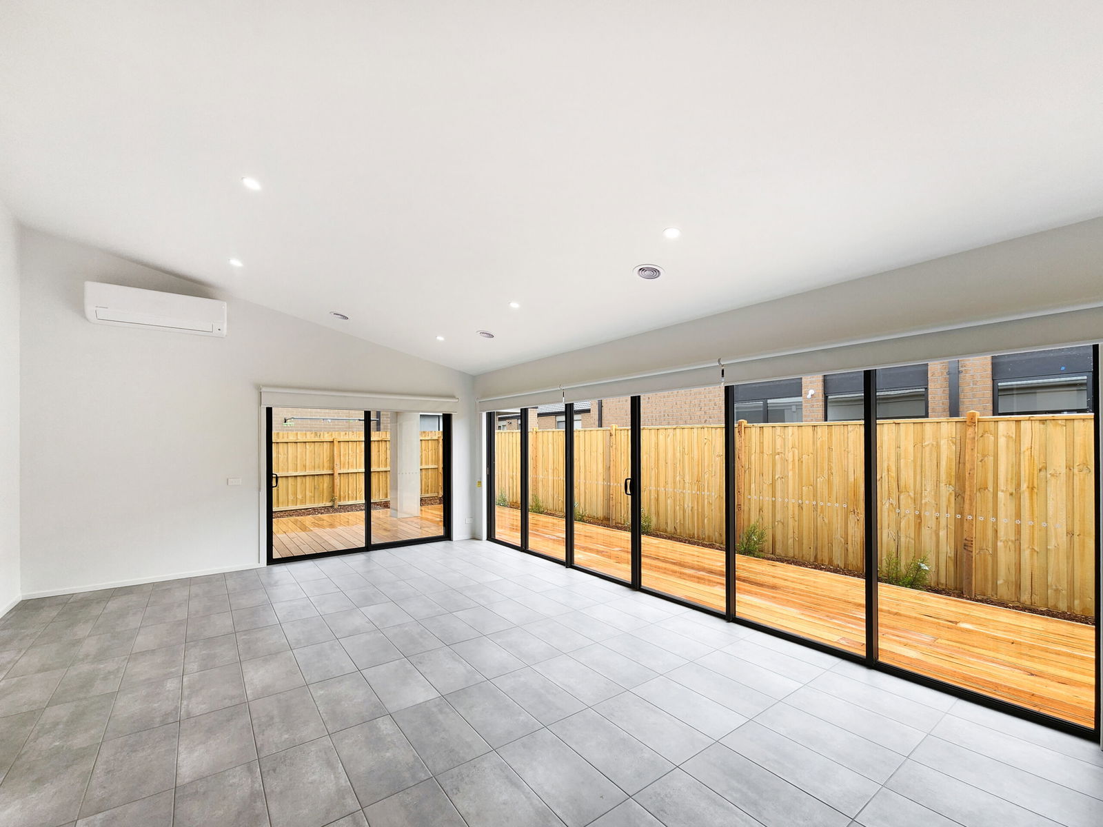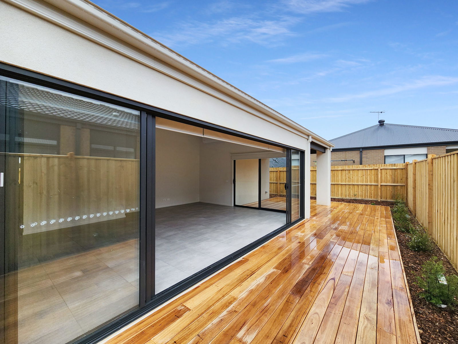 – Light-filled open plan living living and dining area at the rear of the home with floorboards throughout and a stunning raked ceiling – sliding staked doors lead to the beautiful decked area