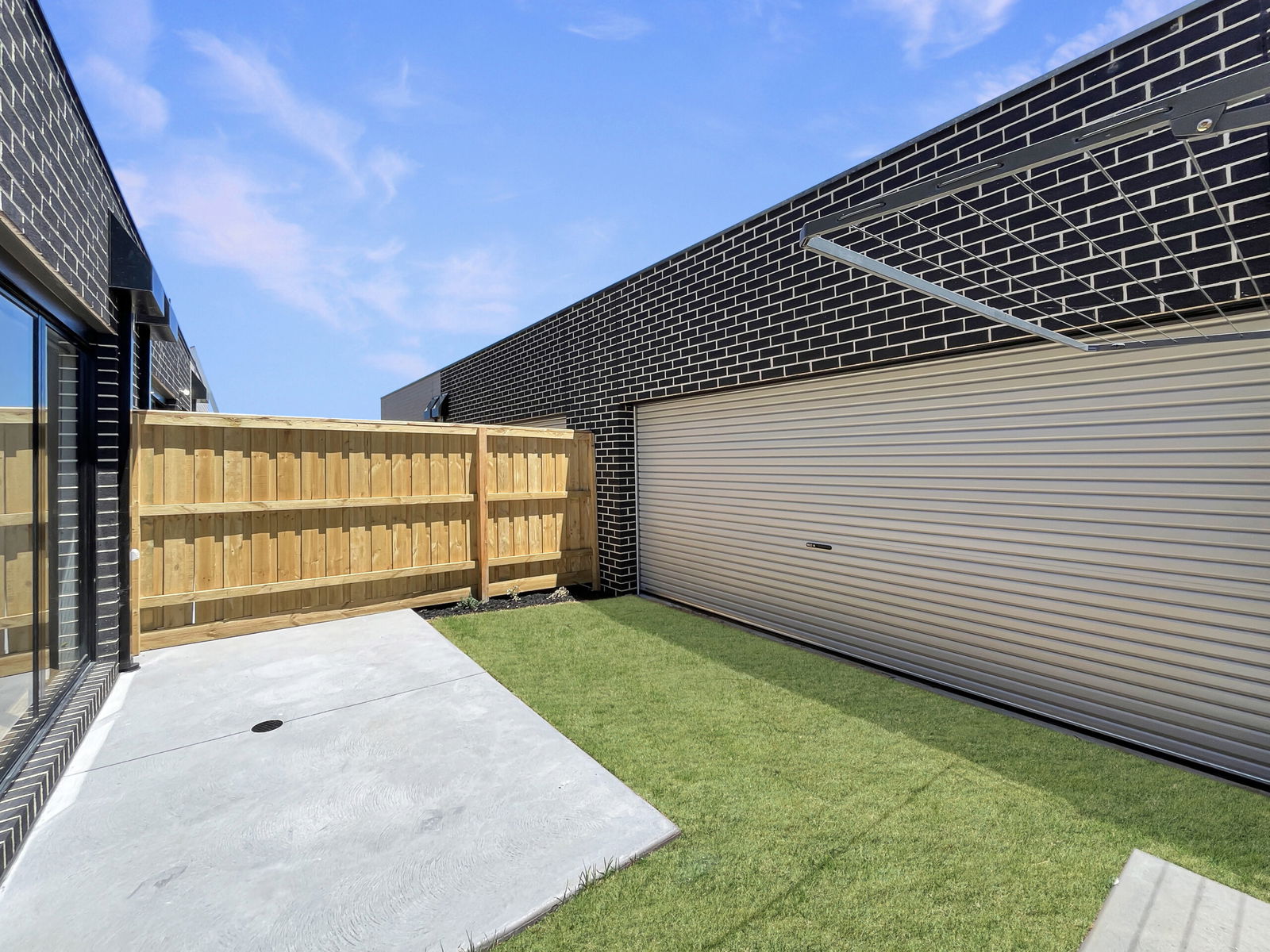 – Low-maintenance backyard with clothesline and external light