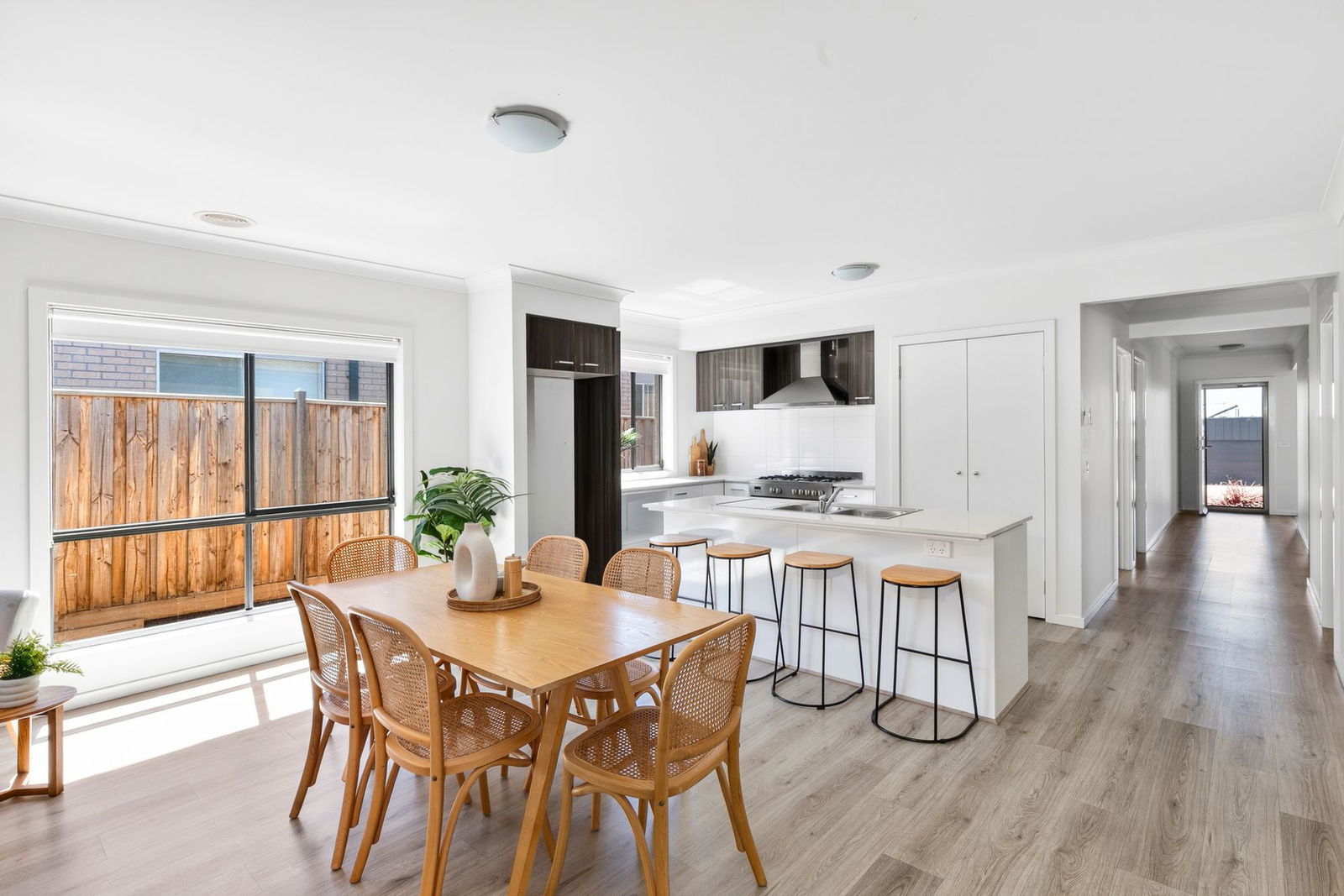 Open Plan Living/Dining: Adjoining the kitchen, the open plan living and dining zone is highlighted by high ceilings and timber-look flooring, creating a warm and inviting atmosphere. Enjoy all-day natural light through south and west-facing windows, fitted with roller blinds for privacy and comfort. A glass sliding door provides direct access to the south-facing alfresco and rear yard, while ducted heating and split-system cooling ensure year-round comfort.