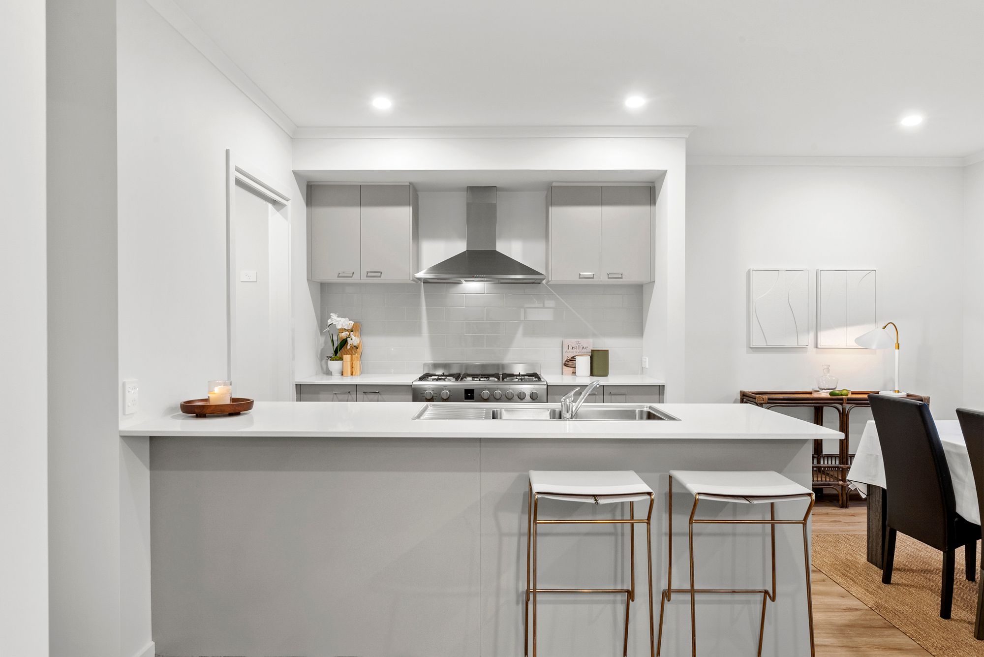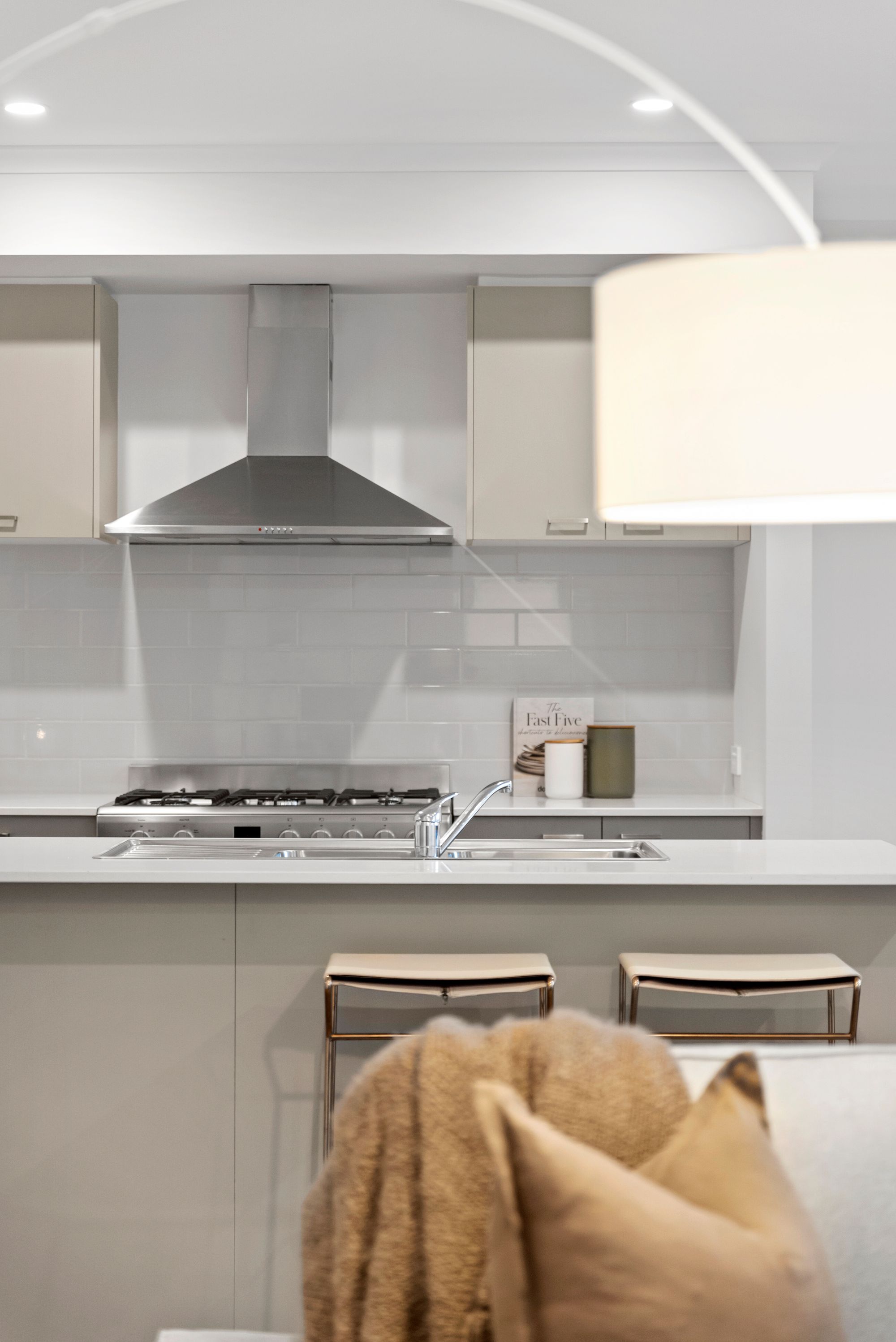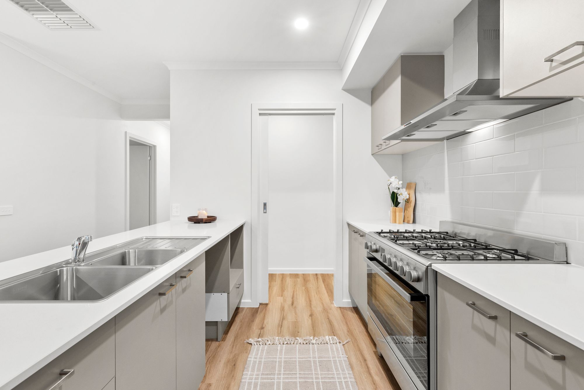 Kitchen- 900mm gas cooktop, oven & rangehood, subway tile splashback, 20mm stone benchtops, dishwasher provision, walk in pantry with built in shelving and ample storage, double sink, chrome fittings, downlights, timber laminate flooring.