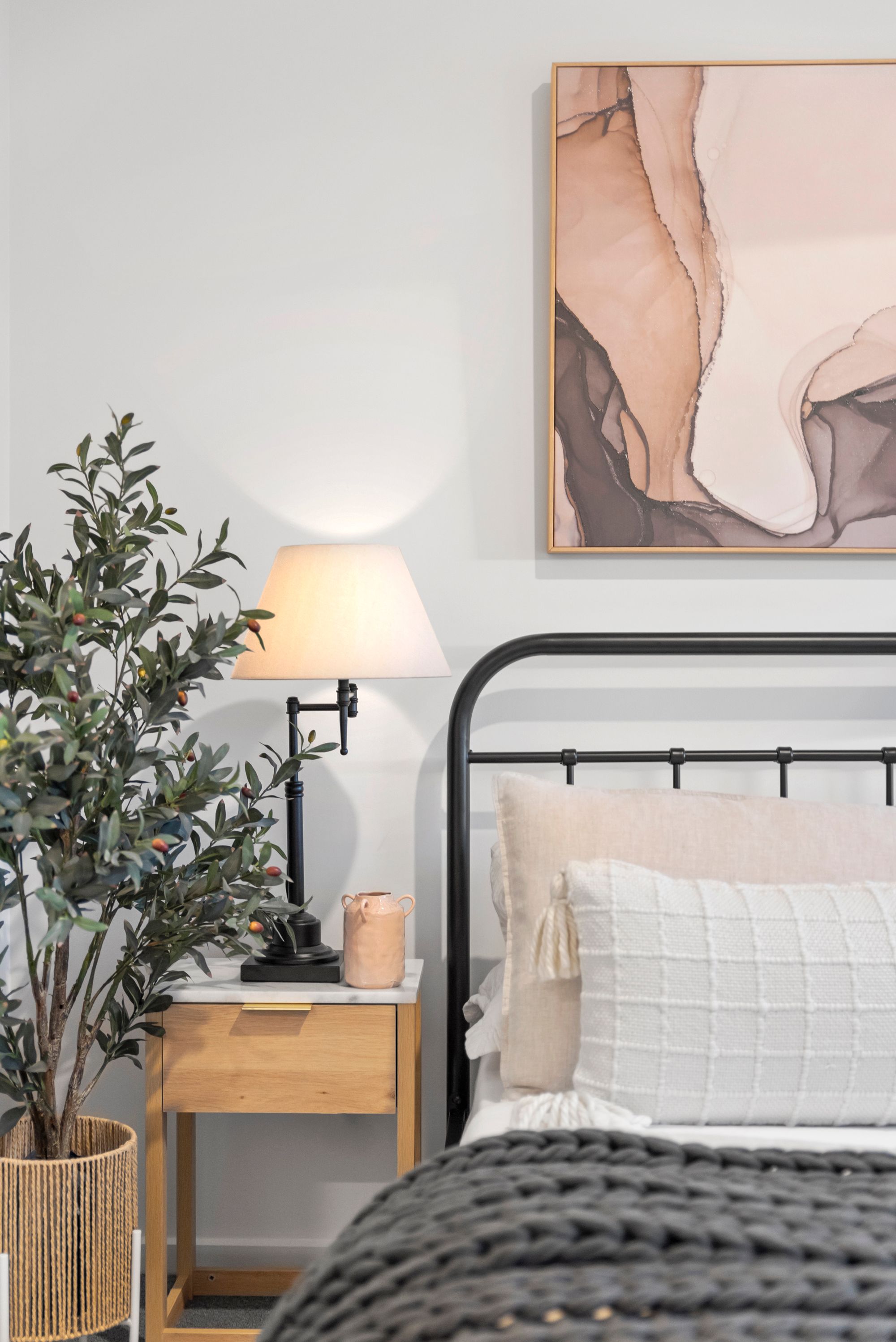 Master bedroom- Carpeted, gas ducted heating, high light windows with roller blinds, walk in robe. Ensuite with single vanity, mirror splashback, 20mm stone benchtop, semi framless shower tiled with handheld shower head, toilet, window with blinds.