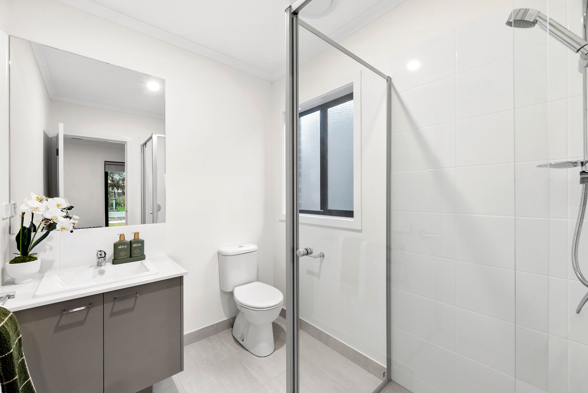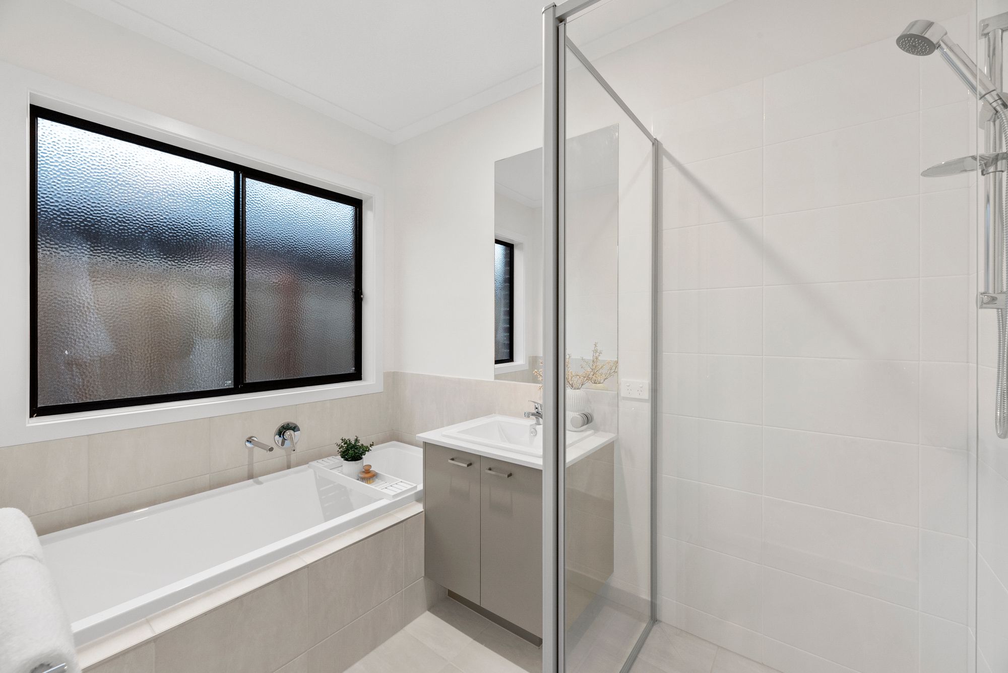 Main bathroom- single vanity, mirror splashback, 20mm stone benchtop, semi framless shower with handheld shower head, bath, window with roller blinds & separate toilet
