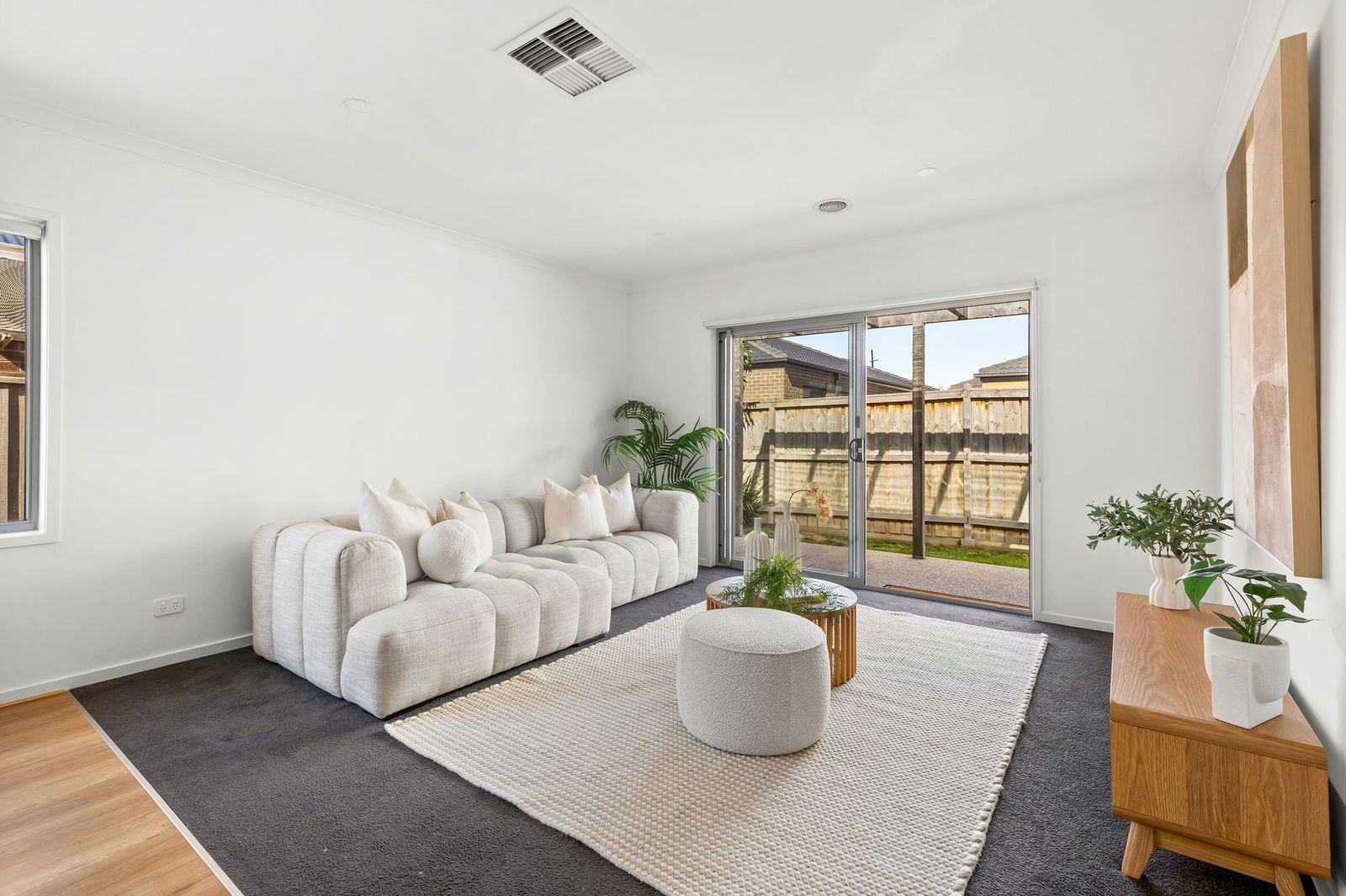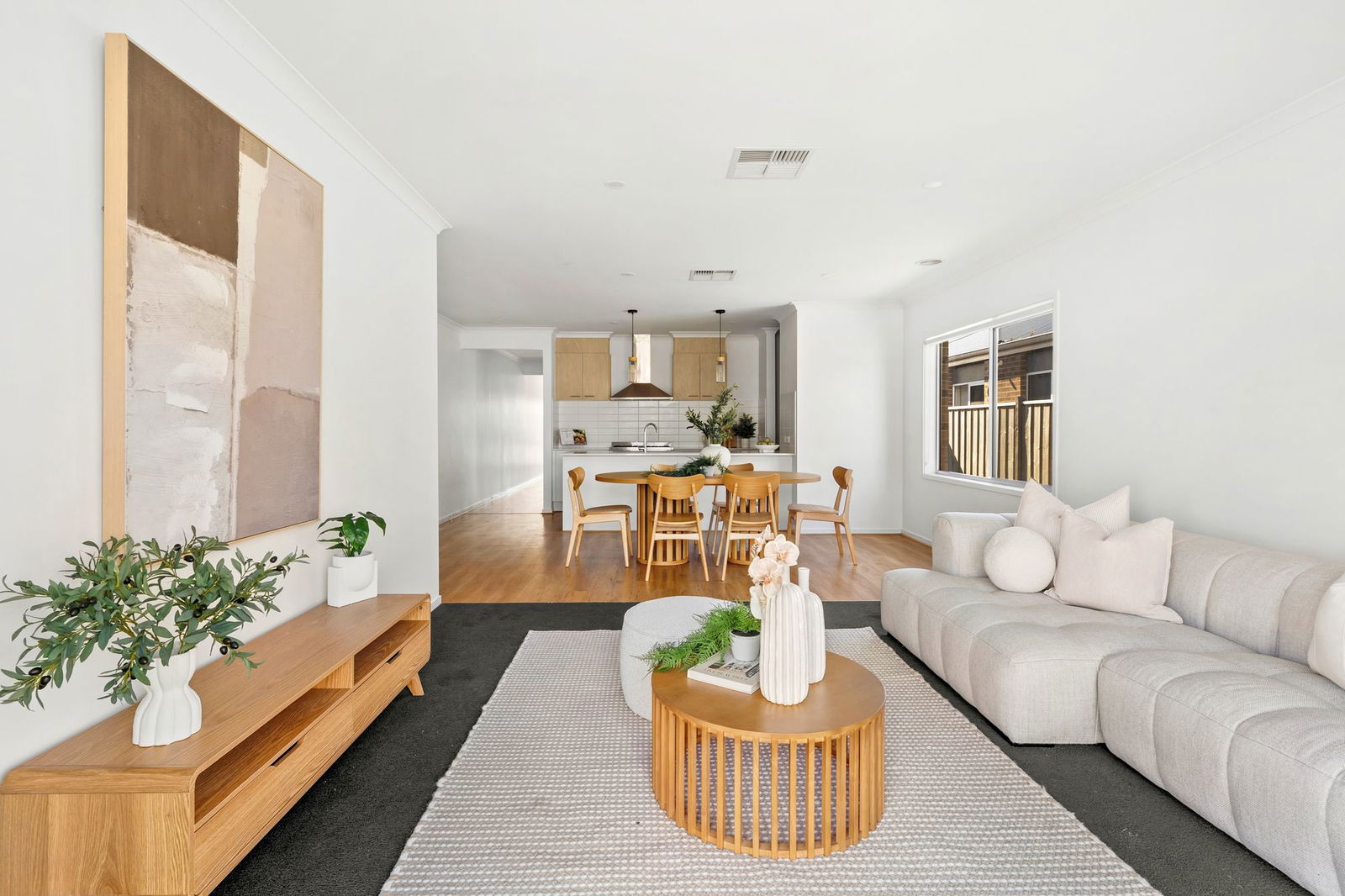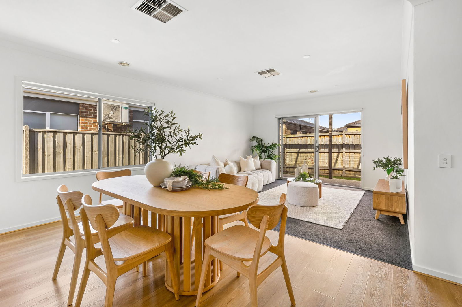 Open plan, timber laminate floorboards & carpet, high ceilings, downlights, roller blinds, ducted heating & evaporative cooling, TV & data points, glass sliding doors to undercover alfresco creating a beautiful indoor/outdoor flow