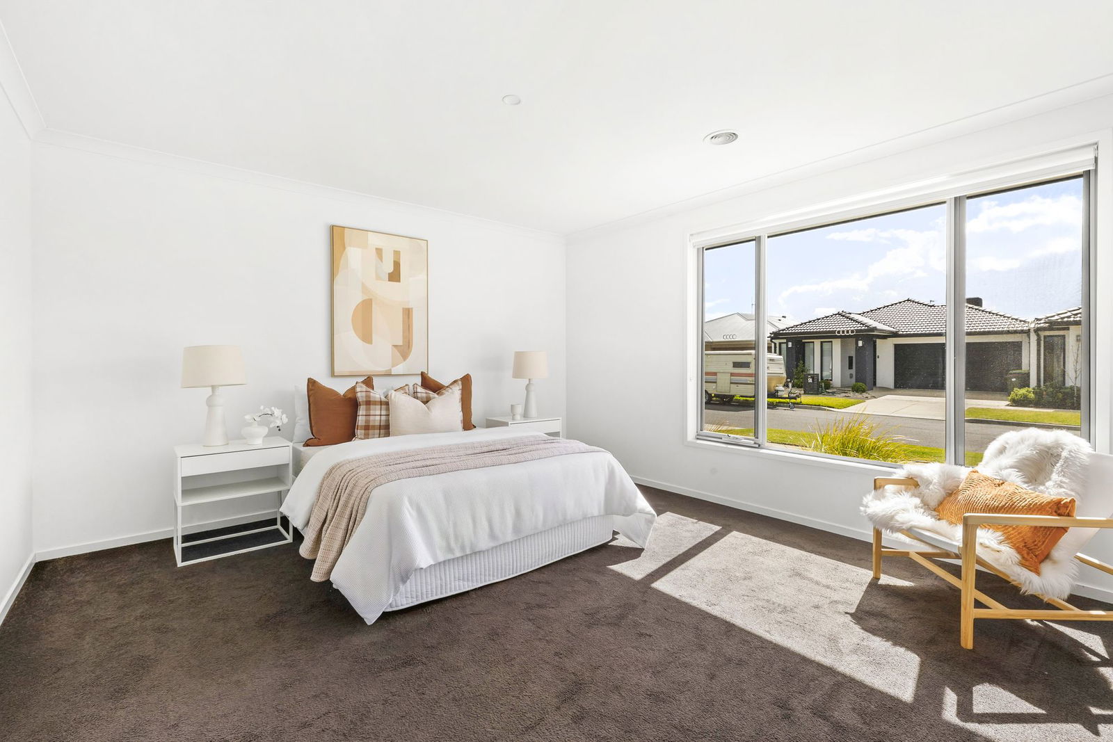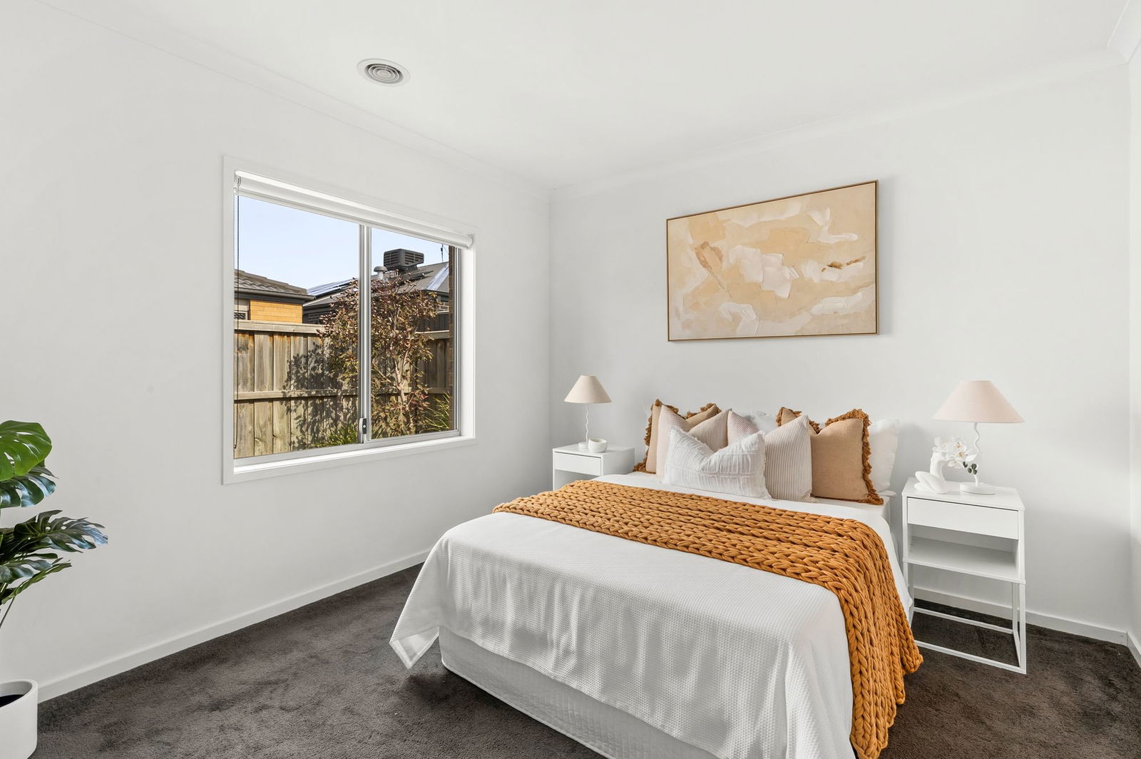 Carpeted flooring, high ceilings, evaporative cooling & ducted heating, downlights, window with roller blind, built-in wardrobes