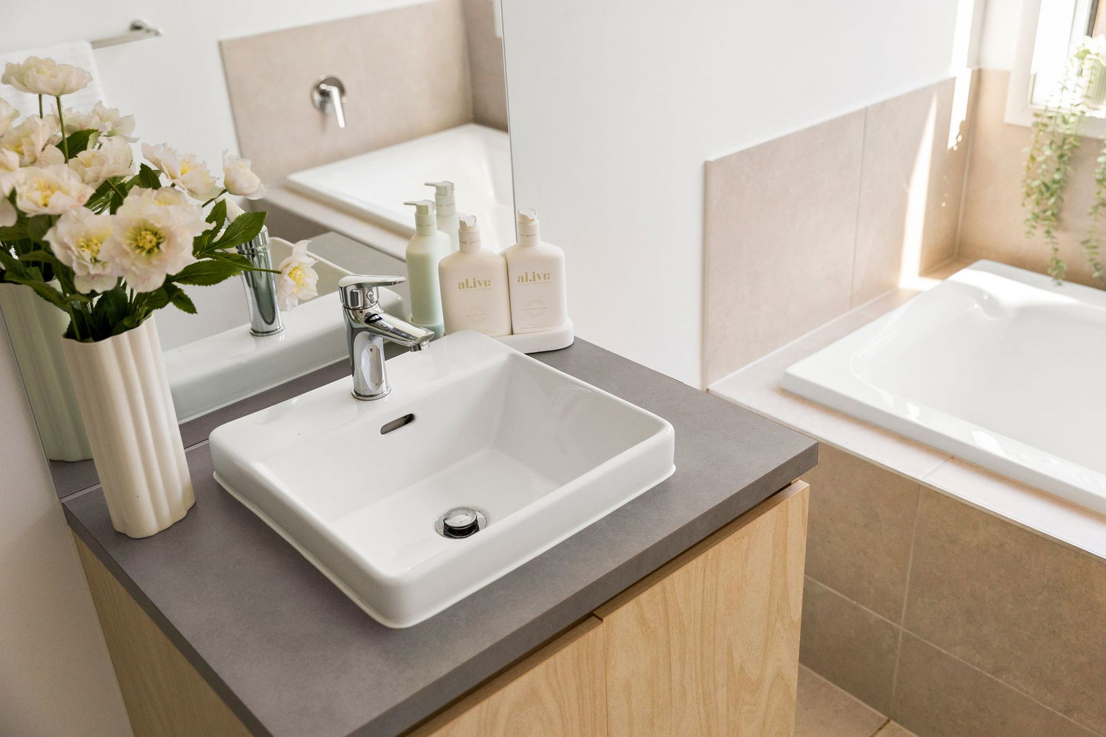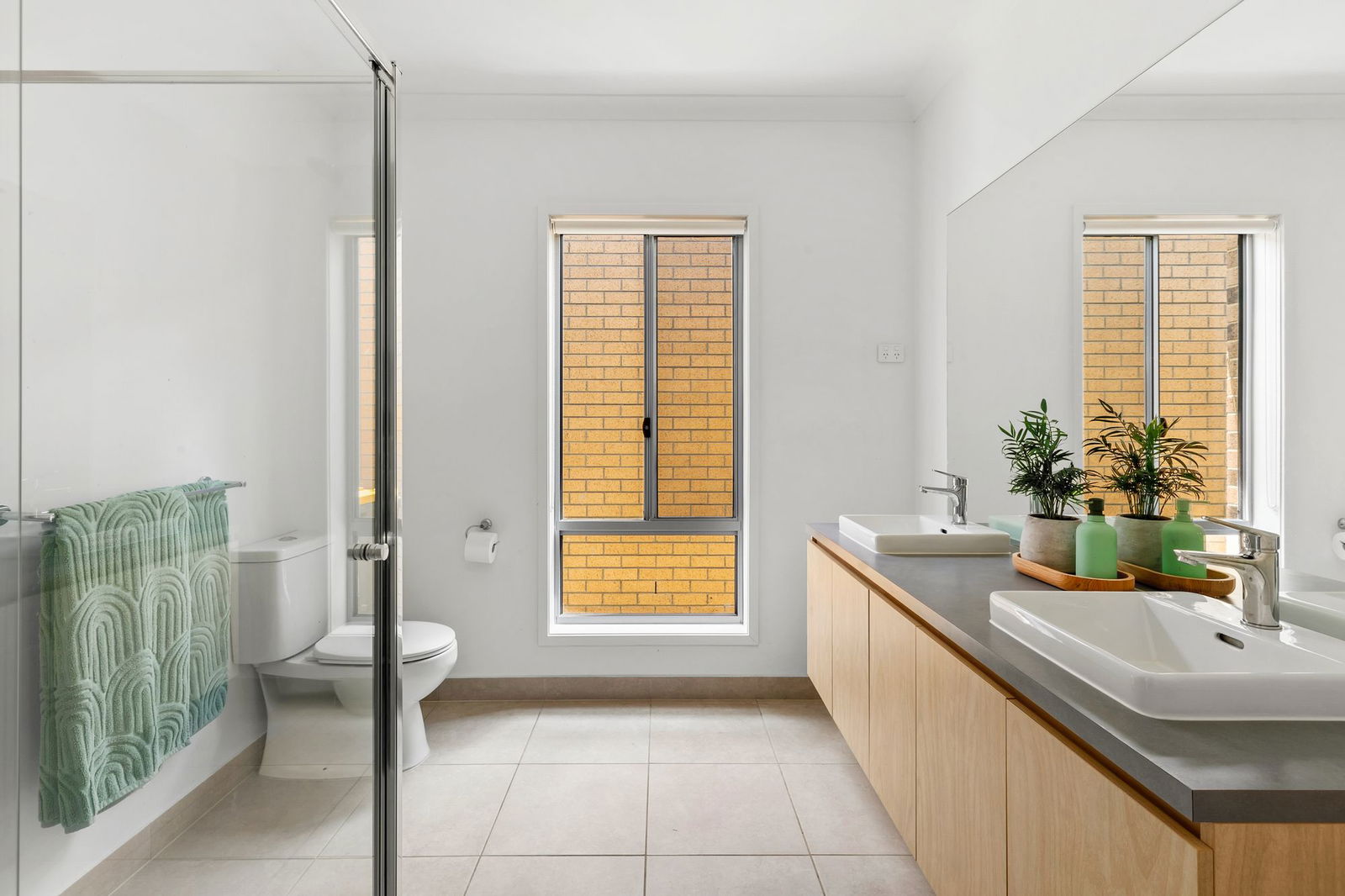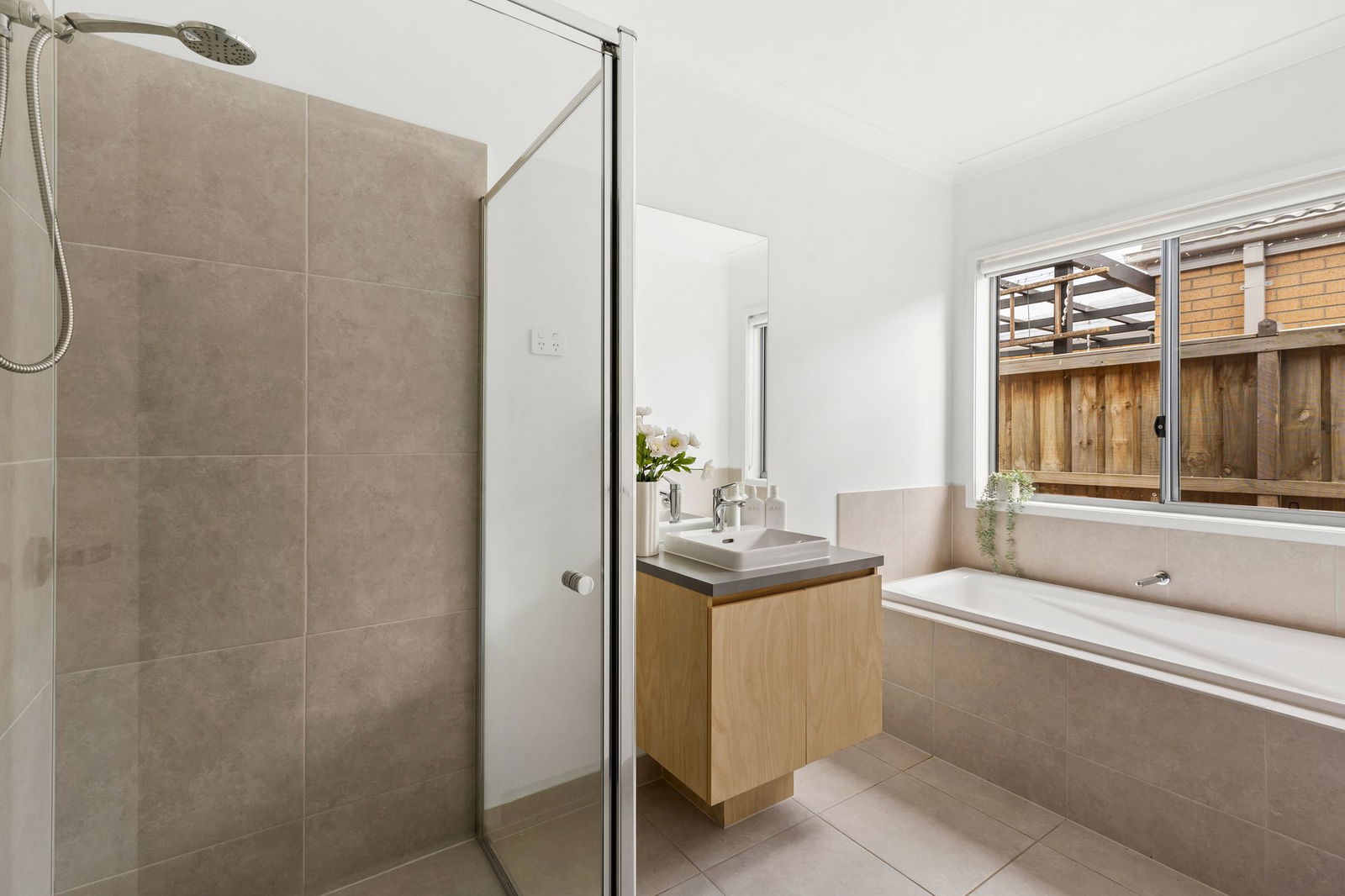 Tiled, single vanity with storage, semi-frameless shower with handheld showerhead, tiled & mirror splashback, bath, window with roller blind, separate toilet