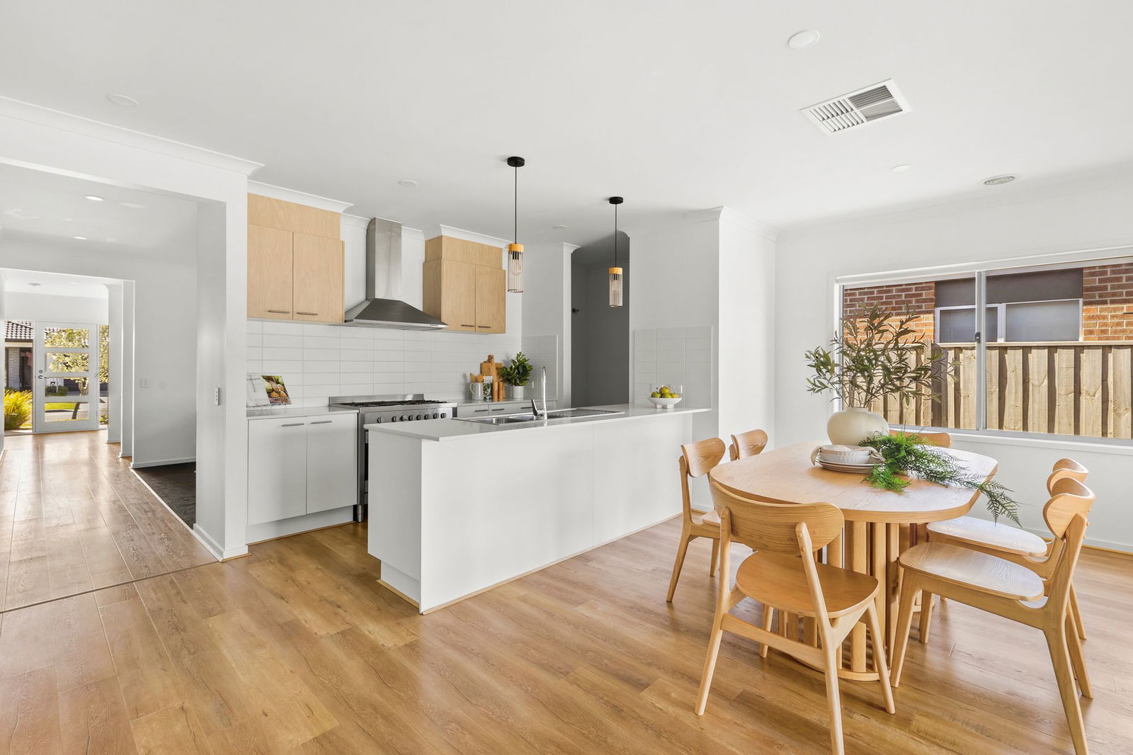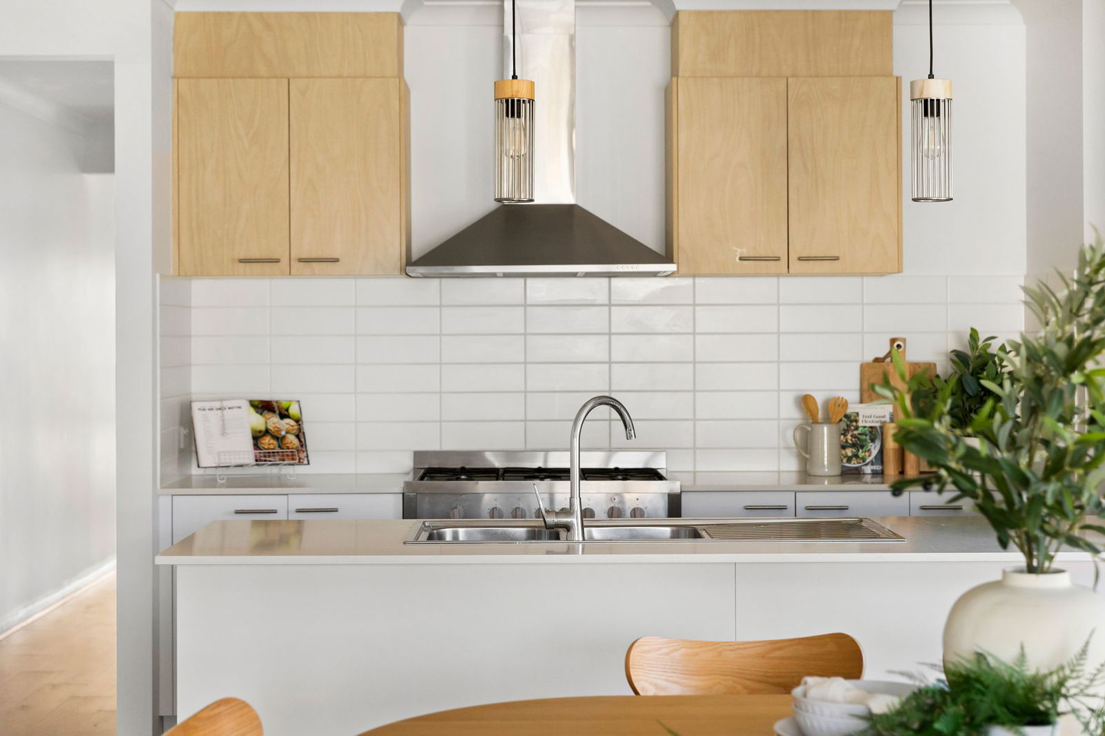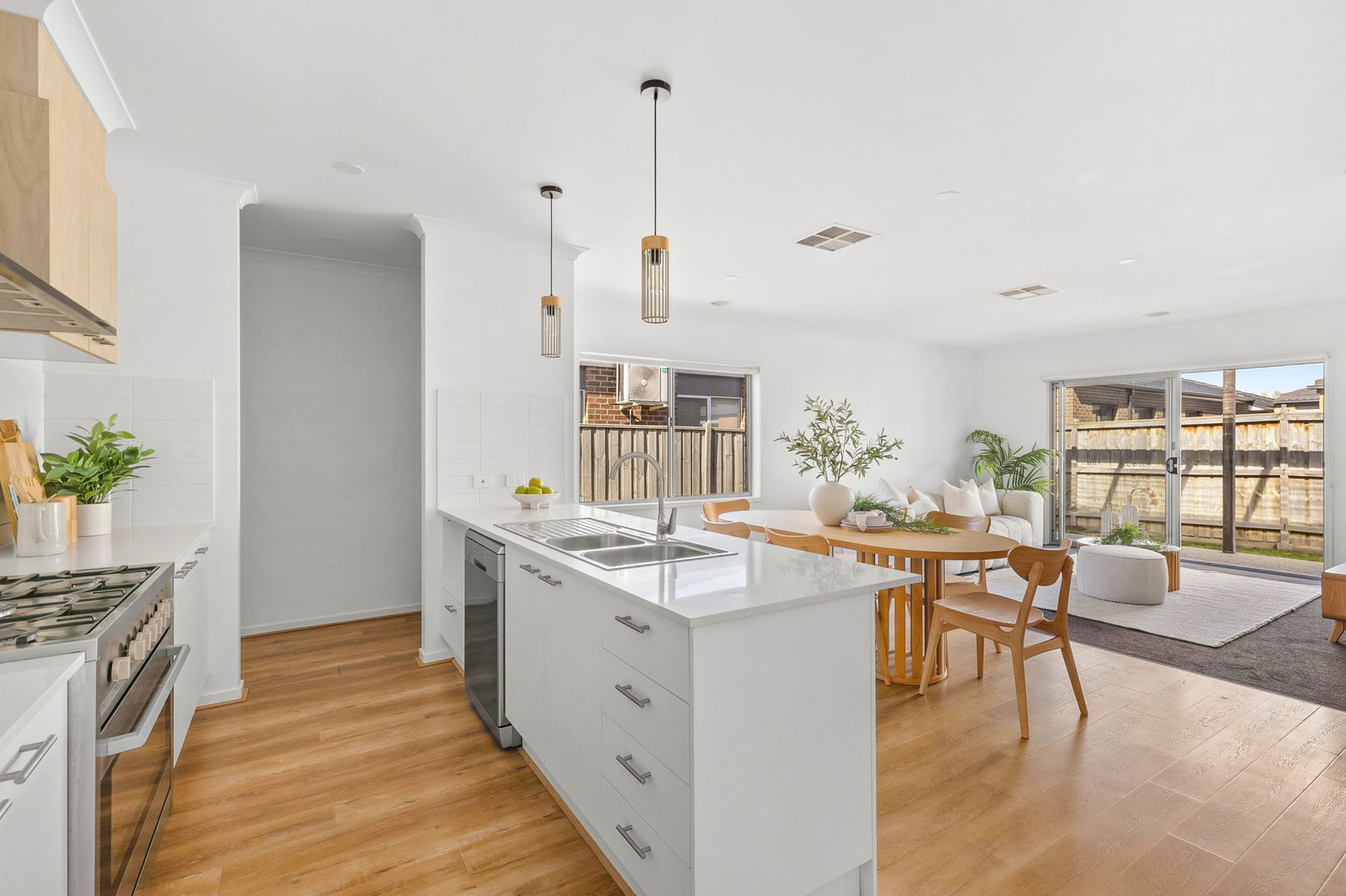 20mm stone benchtops throughout, double sink with integrated drying rack, 900mm oven/cooktop/rangehood, tiled splashback, walk-in pantry with generous shelving space & fridge cavity, multiple power points, dishwasher, high ceilings, downlights, pendant lights, chrome fittings, overhead cabinetry
