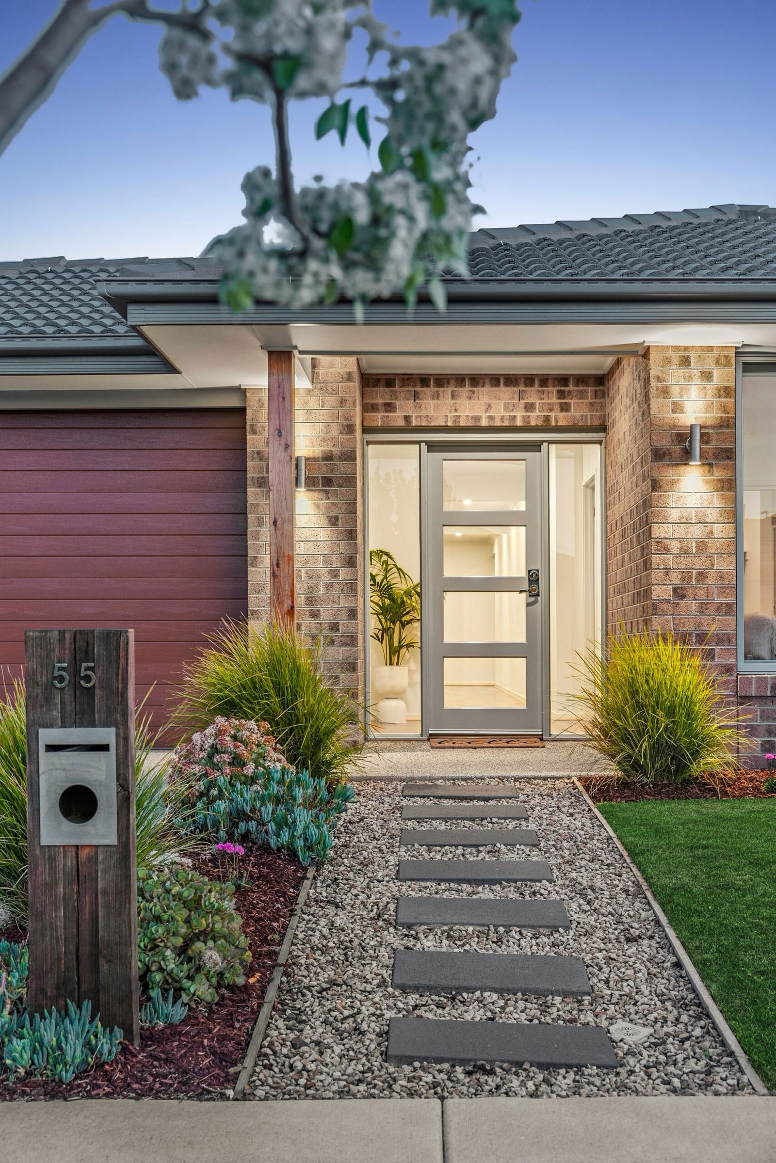 Front Yard: Established garden beds, grass, aggregate concrete driveway