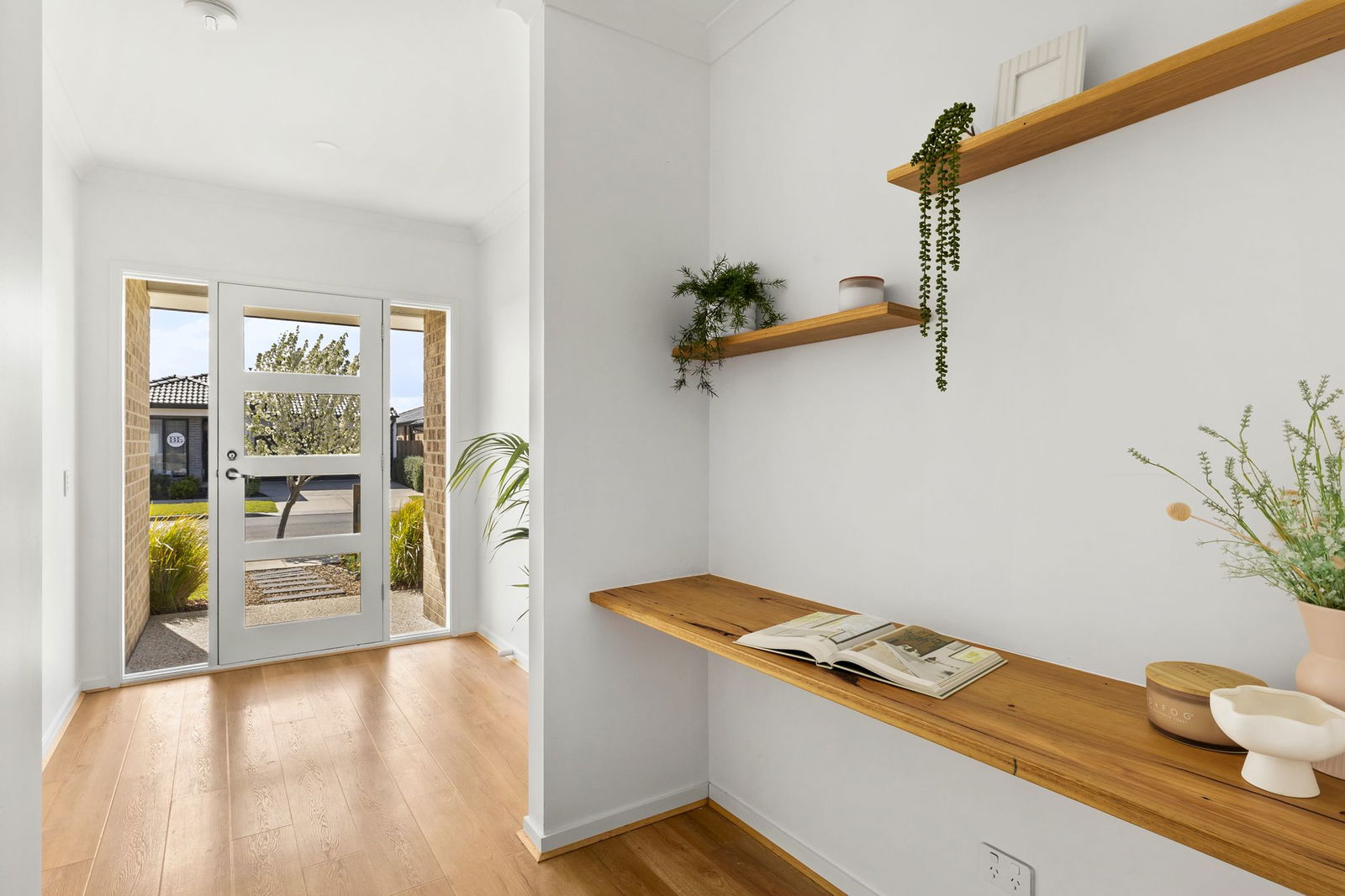 Laundry with trough and outside access, linen closet, built-in feature study nook, high ceilings throughout, downlights throughout, NBN/Opticomm access, double car lock-up garage with remote roller door, recycled water access, stone benchtops throughout, ample storage