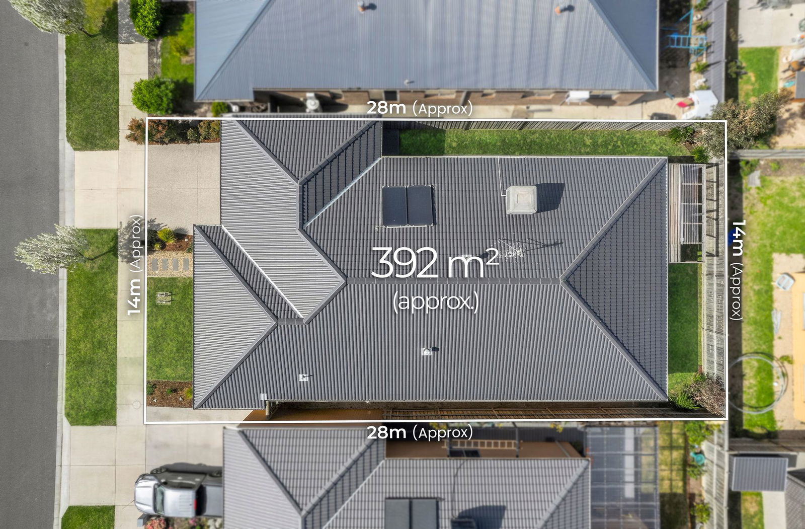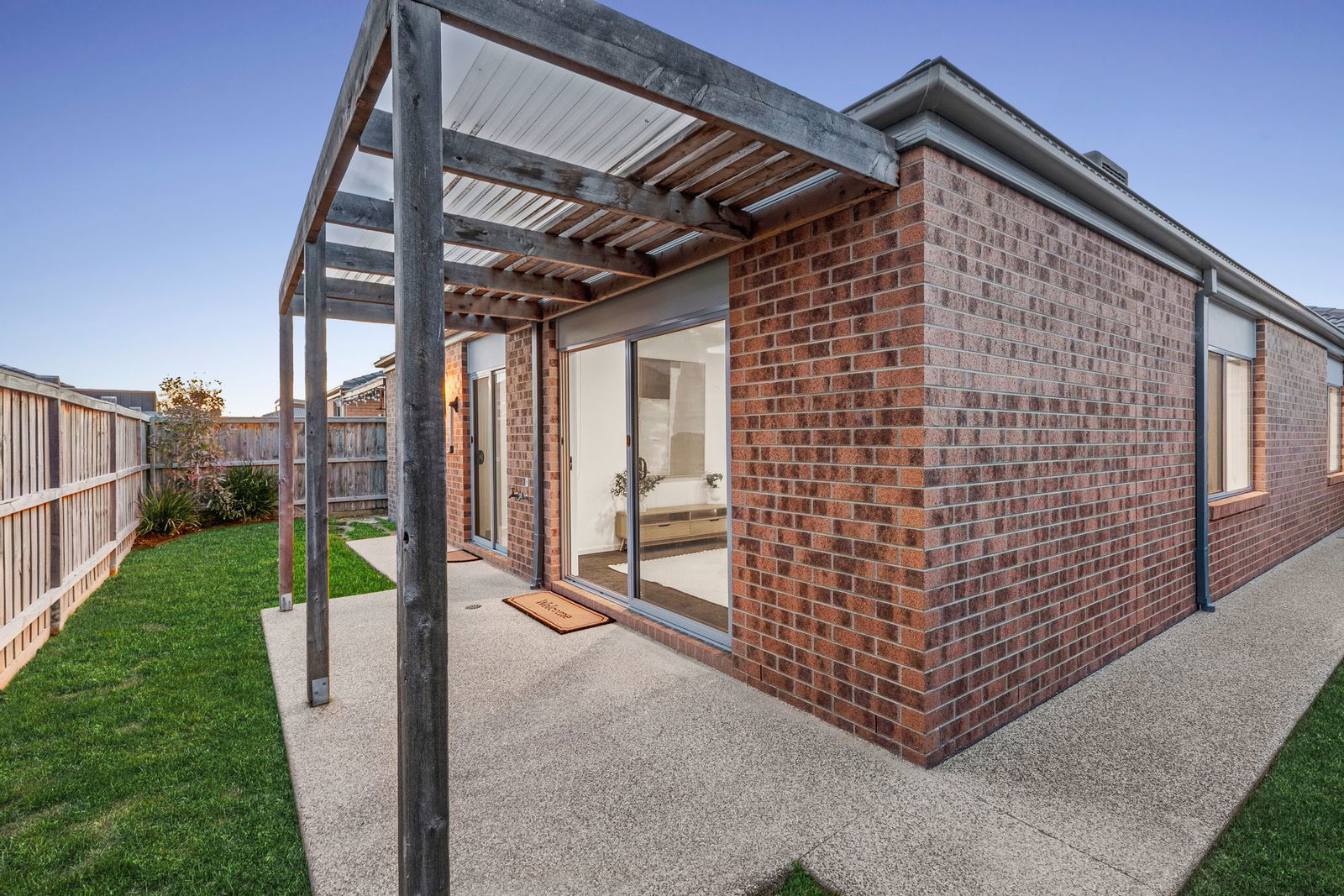 Undercover alfresco, grass yard, low-maintenance garden beds, fully fenced, single side gate access, rear door access to garage, aggregate concrete paths