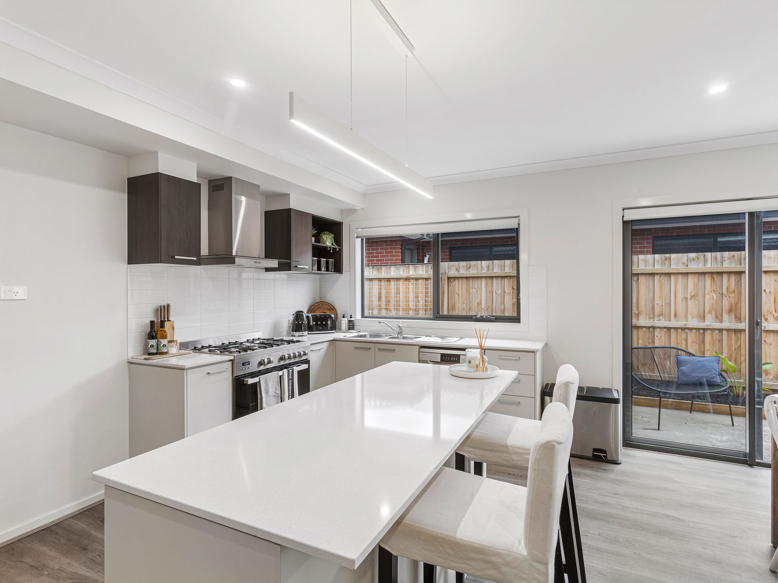 – Large kitchen with stone benchtops, 900mm upright oven, capped water to the fridge space, pendant lighting and walk-in pantry.