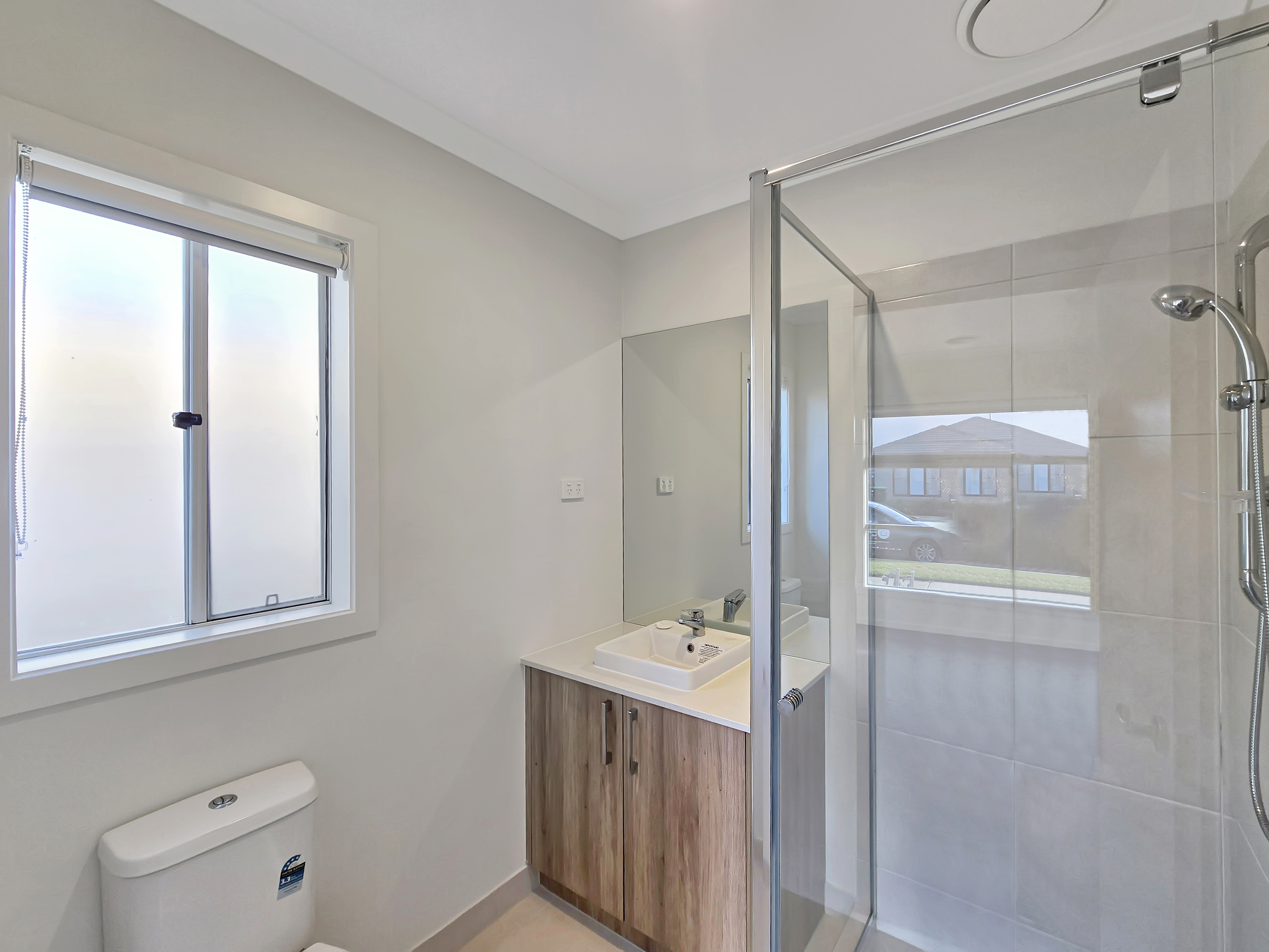 Master suite: Situated at the front of the home, it showcases a spacious walk-in robe and ensuite. Accompanied by roller blinds, ducted heating and carpet underfoot, creating a comfortable space year-round. The modern ensuite consists of a semi-frameless shower with a hand-held shower head, basin & stone benchtop vanity with a mirrored splashback, frosted window and toilet.