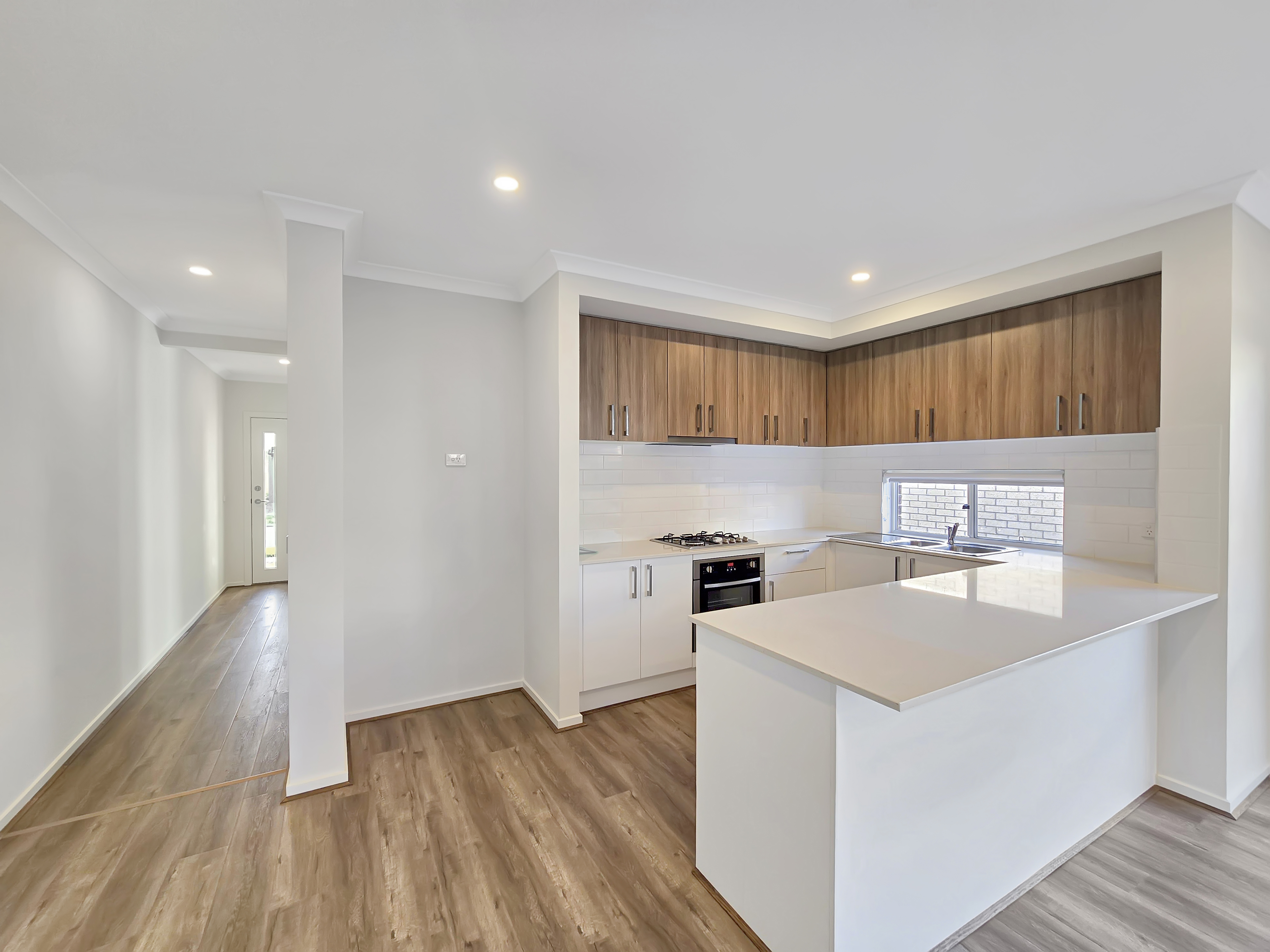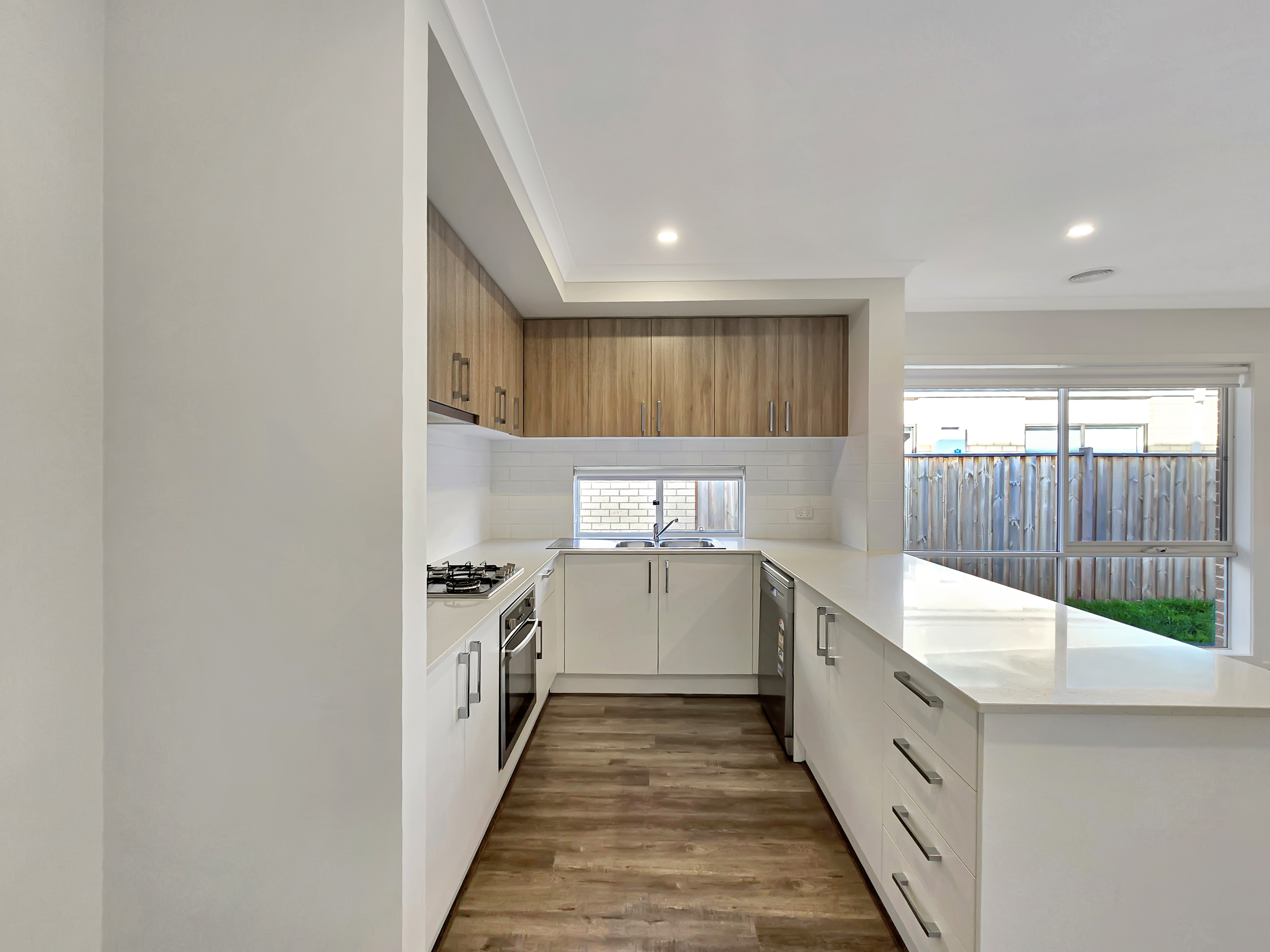 Kitchen: Benchtops with 20mm stone, breakfast bar overhang and stainless-steel double-basin sink, subway tile splashback & feature window splashback, downlights, coastal wood-look overhead storage, integrated 900mm oven, stovetop & rangehood, built in pantry.