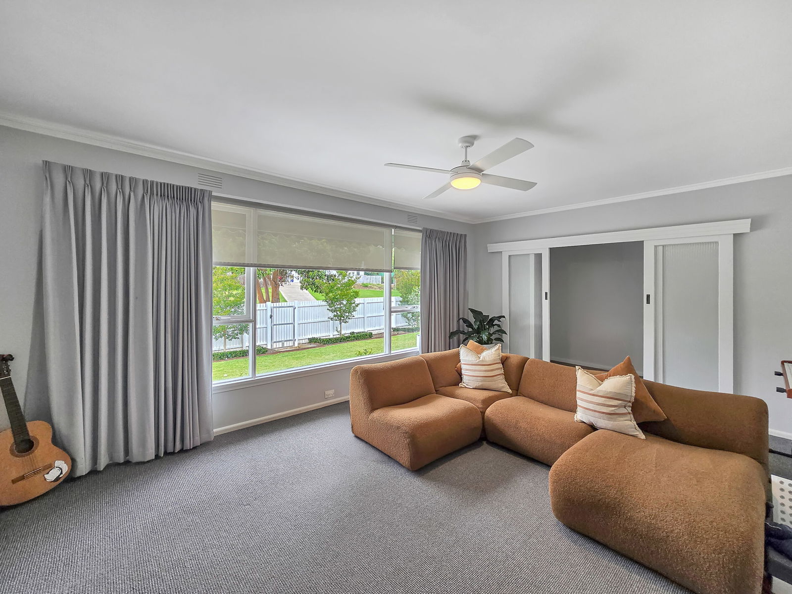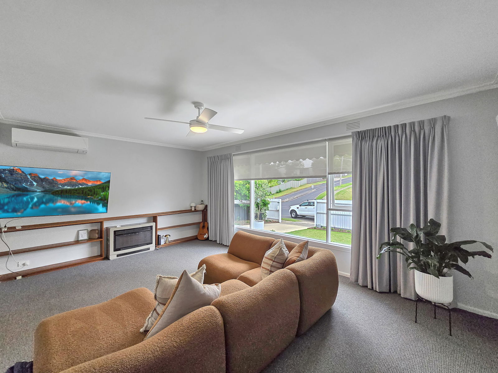 – Spacious living room with ceiling fan and split system heating and cooling
