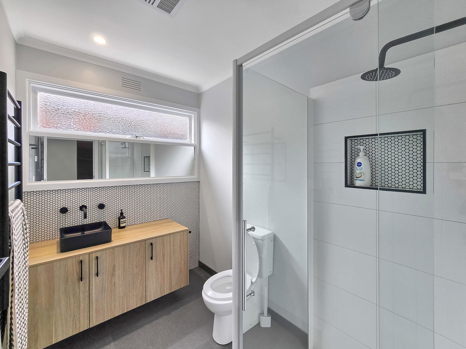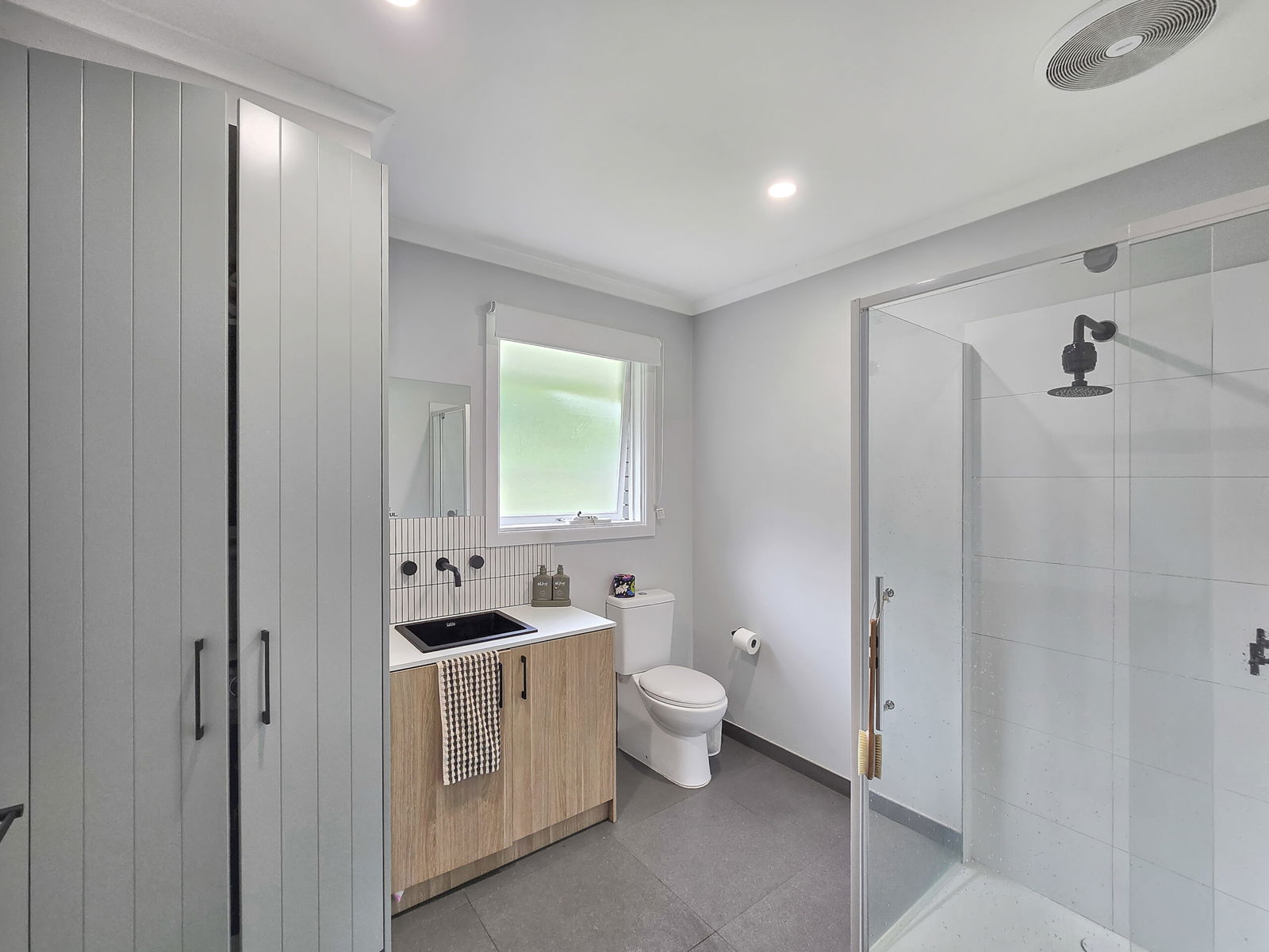– Master bedroom with built-in robe and ceiling fan, ensuite with a shower, toilet and vanity
