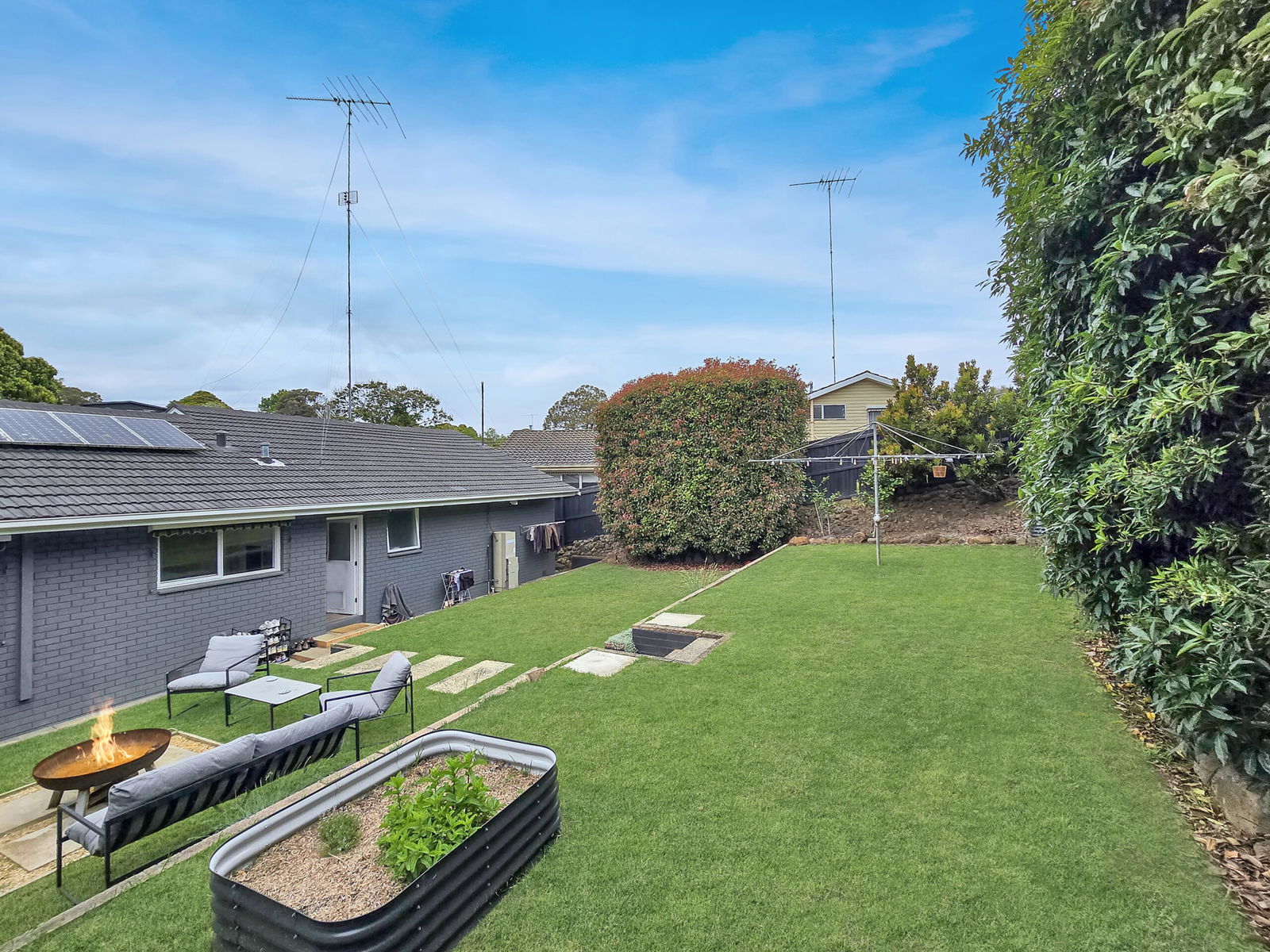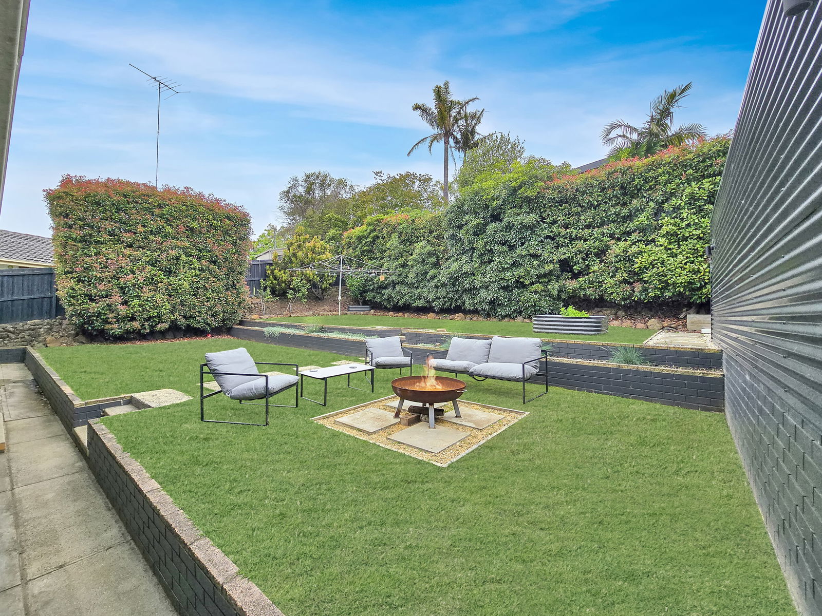 – The fully enclosed backyard is easy to maintain, and comes with a garden bed and firepit area