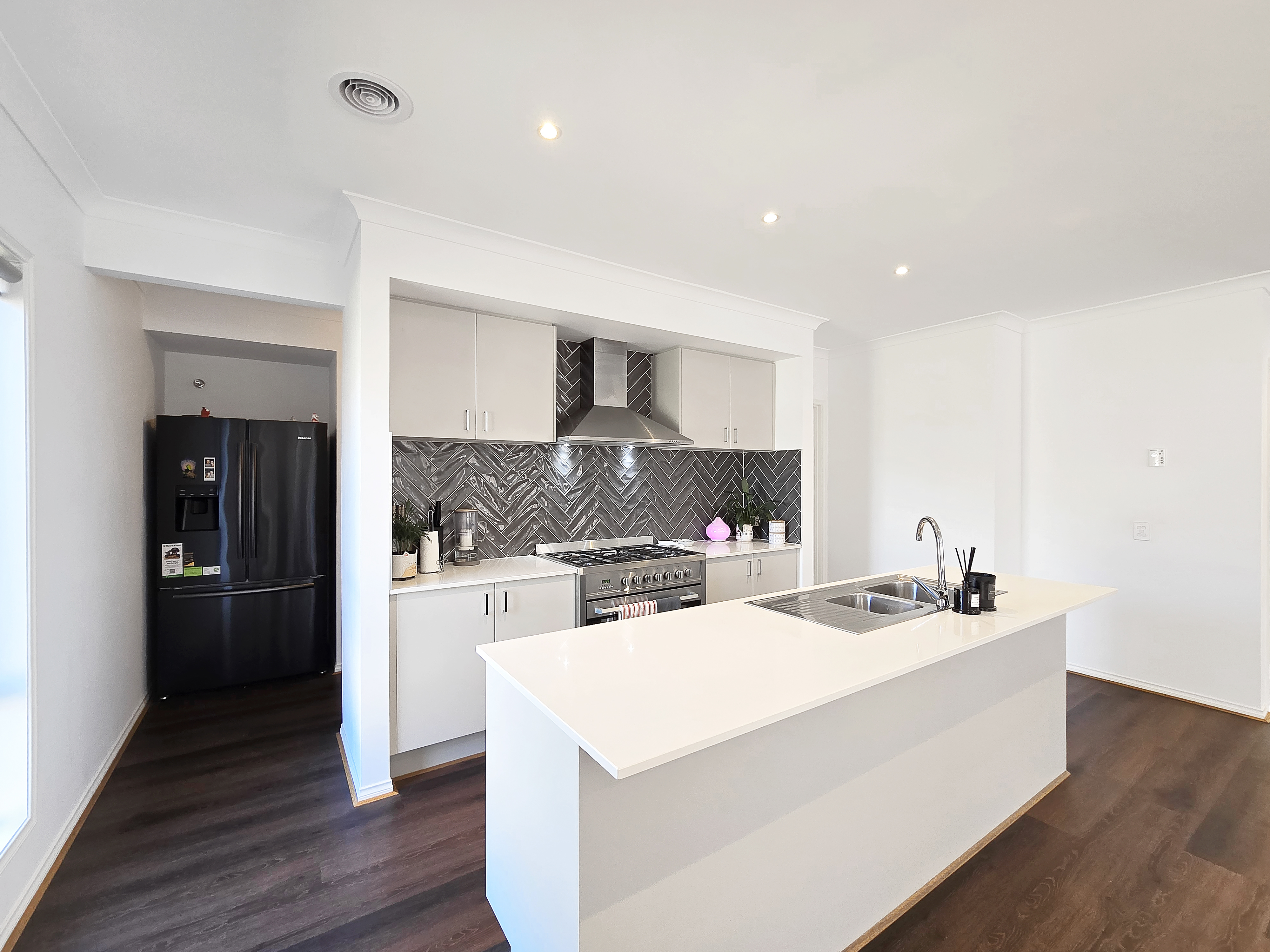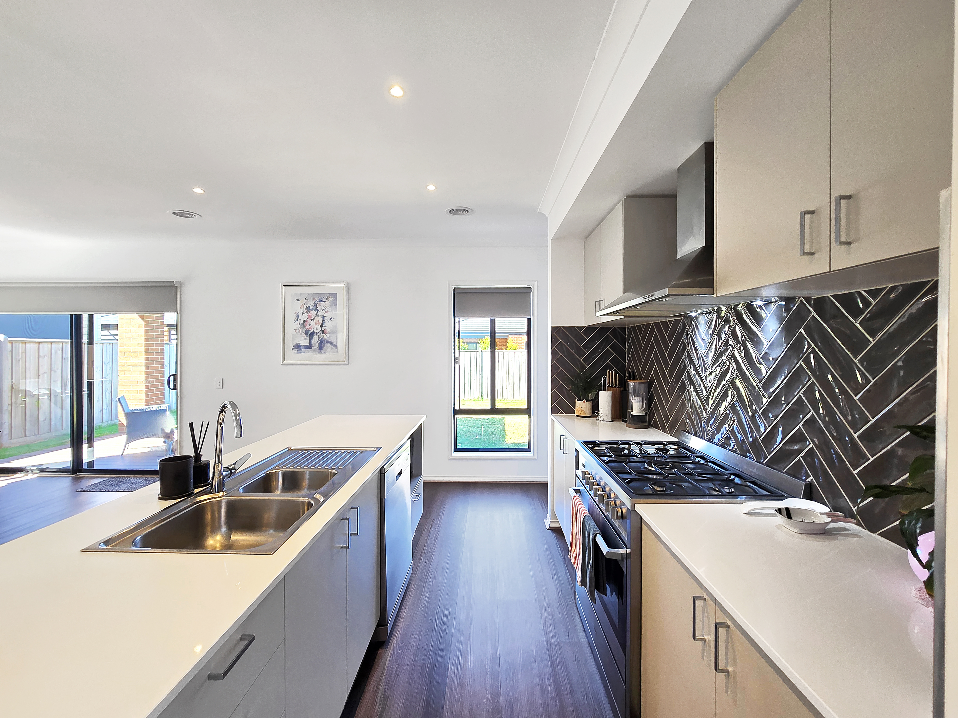 – Stylish modern kitchen with feature tiled splash-back, stone bench-tops, double sink, 900mm stainless steel oven, 5 burner gas cooktop, dishwasher, plenty of cupboard & drawers, and a large walk in pantry