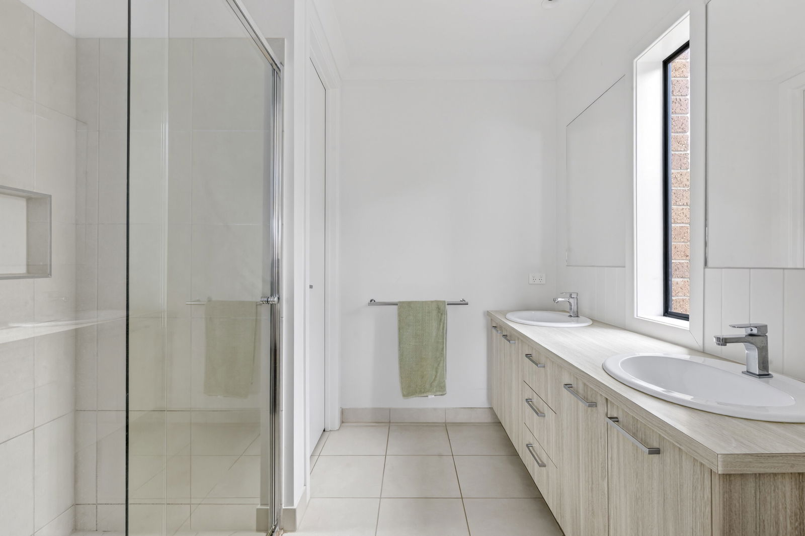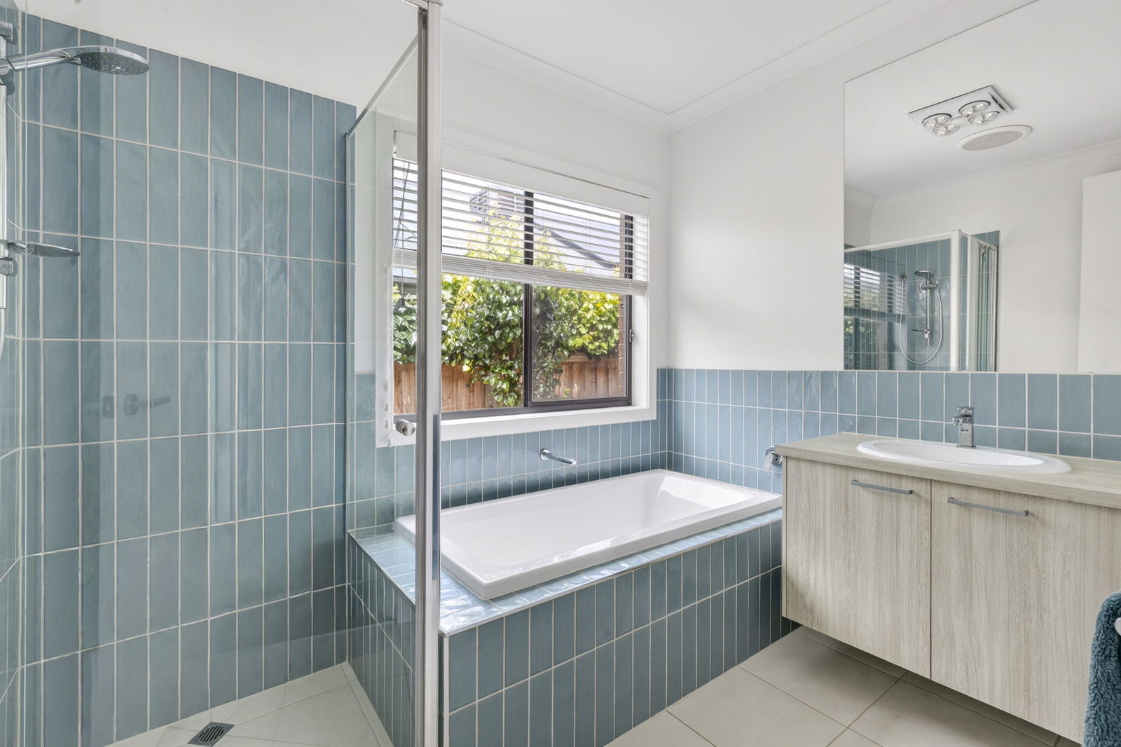 Upgraded feature tiling, single vanity with basin and ample storage, mirror splashback, semi-frameless shower, tiled shower niche, tiled in bath, ceiling light, heat lamp, multiple power points, and separate toilet.