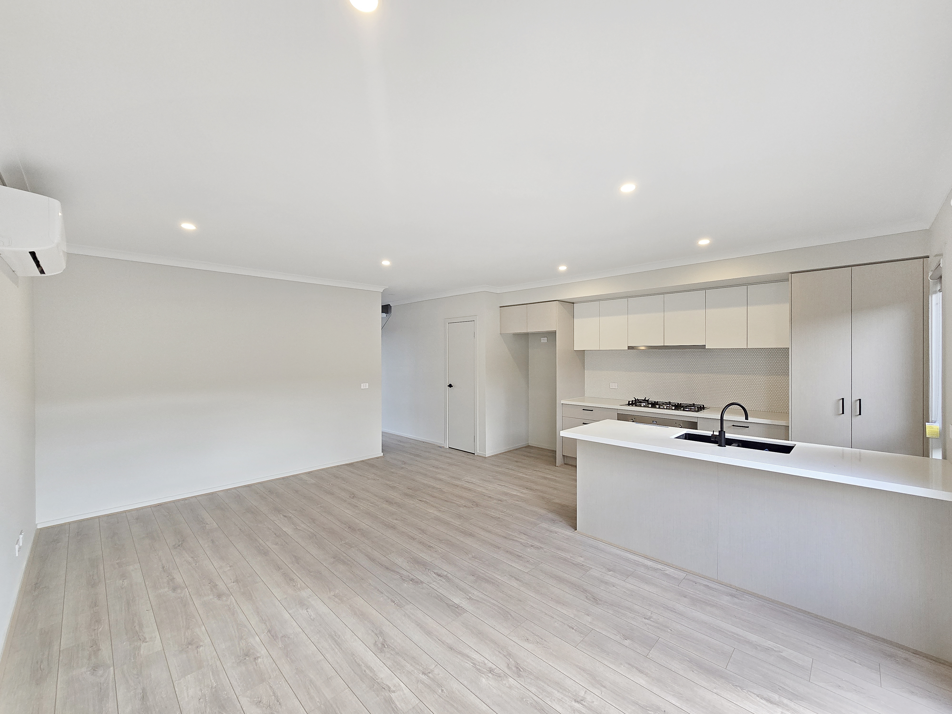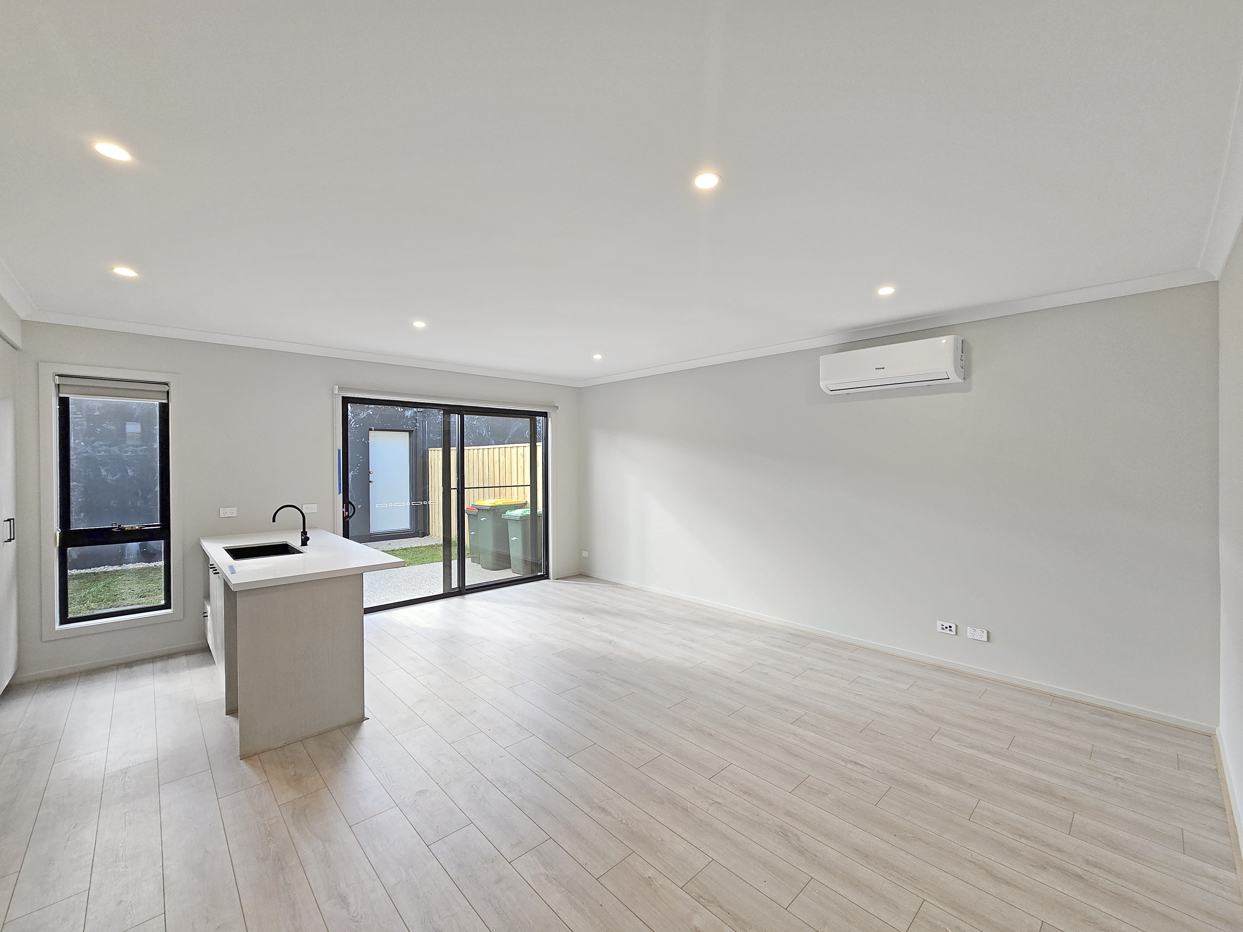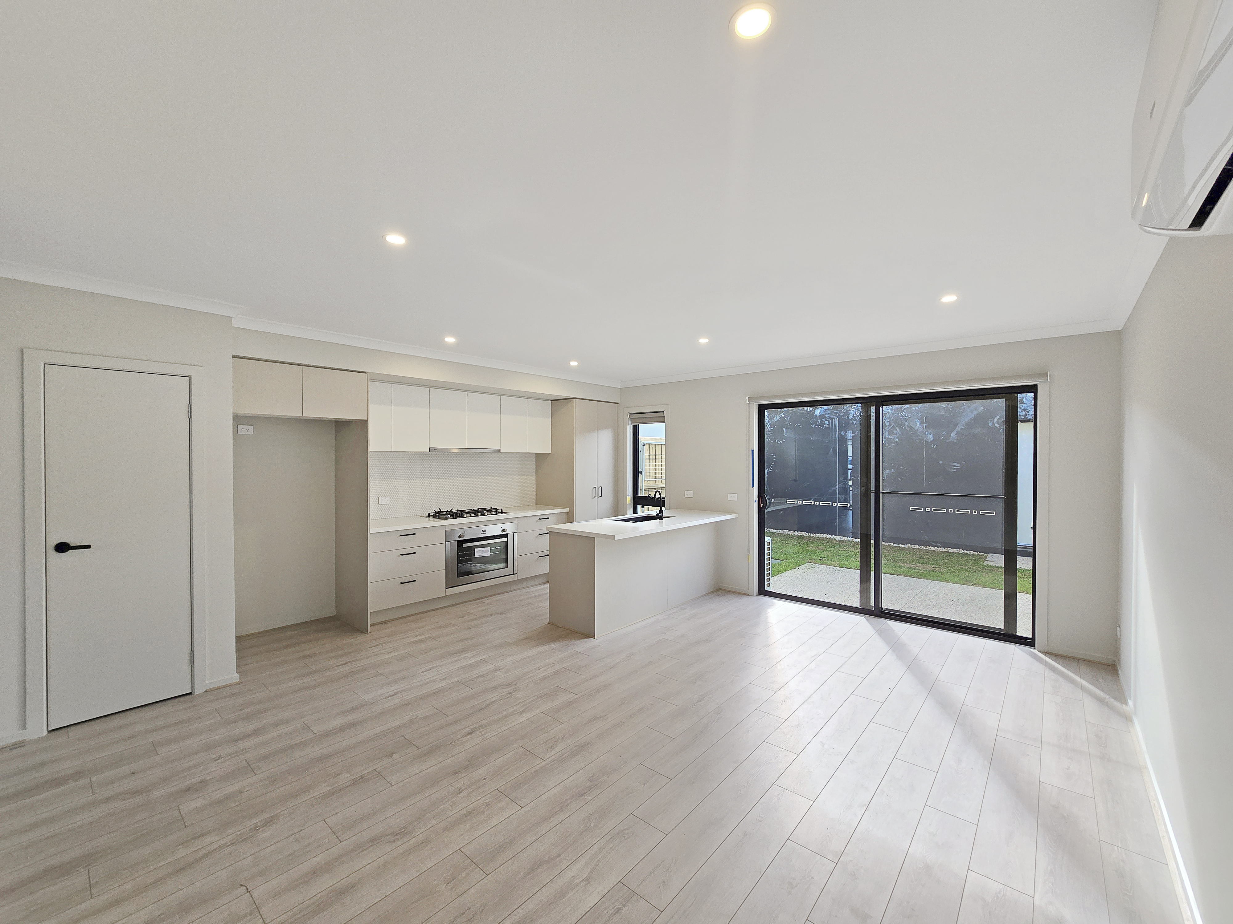 – Open plan living, kitchen and dining area with plenty of natural light and a split system